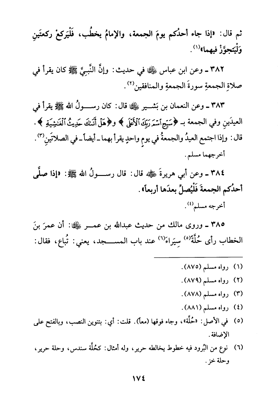 383 - وعن النعمان بن بَشير -رضي اللَّه عنهما- قال: كان رسولُ اللَّه -صلى اللَّه عليه وسلم- يقرأ في العيدَينِ وفي الجمعة بـ {سَبِّحِ اسْمَ رَبِّكَ الْأَعْلَى} و {هَلْ أَتَاكَ حَدِيثُ الْغَاشِيَةِ}. قال: وإذا اجتمع العيدُ والجمعةُ في يومٍ واحدٍ يقرأ بهما -أيضًا- في الصلاتَينِ (¬3).