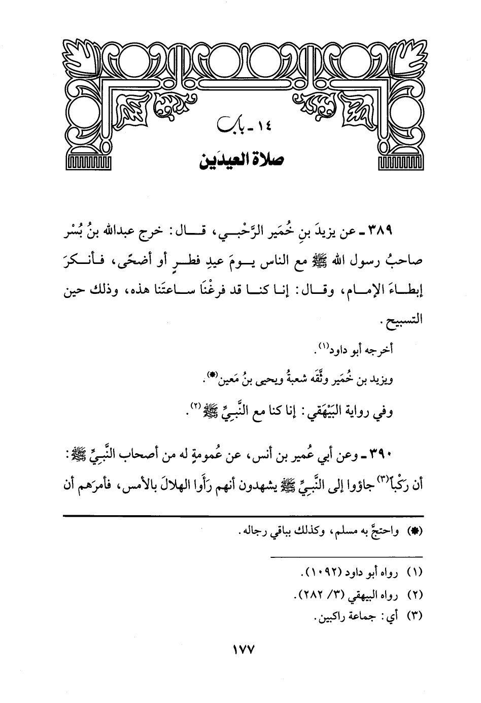 390 - وعن أبي عُمير بن أنس، عن عُمومةٍ له من أصحاب النَّبِيِّ -صلى اللَّه عليه وسلم-: أن رَكْبًا (¬3) جاؤوا إلى النَّبِيِّ -صلى اللَّه عليه وسلم- يشهدون أنهم رَأَوا الهلالَ بالأمس، فأمرَهم أن