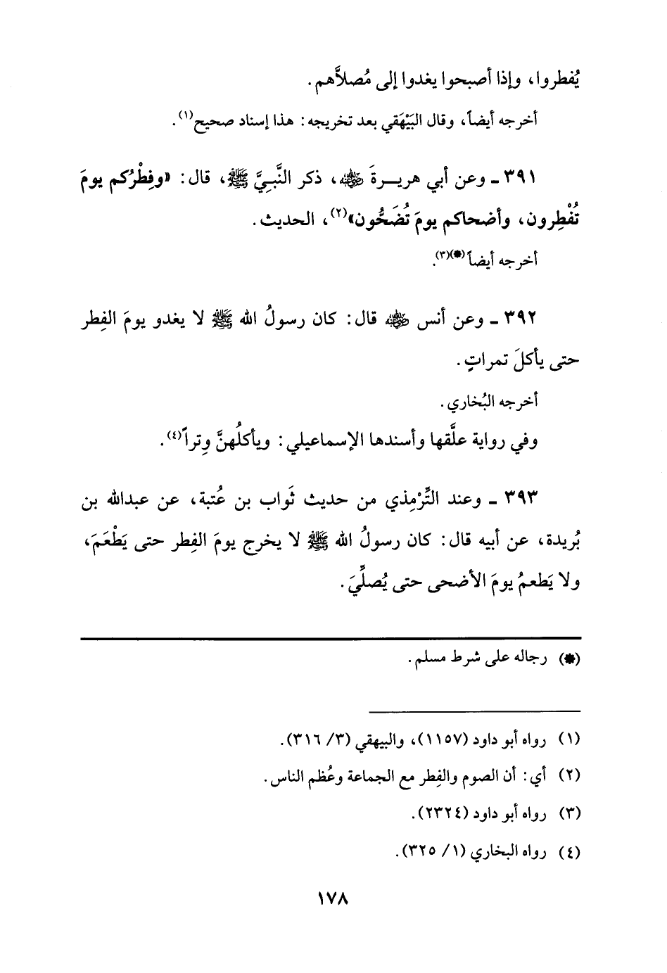 392 - وعن أنس -رضي اللَّه عنه- قال: كان رسولُ اللَّه -صلى اللَّه عليه وسلم- لا يغدو يومَ الفِطر حتى يأكلَ تمراتٍ.