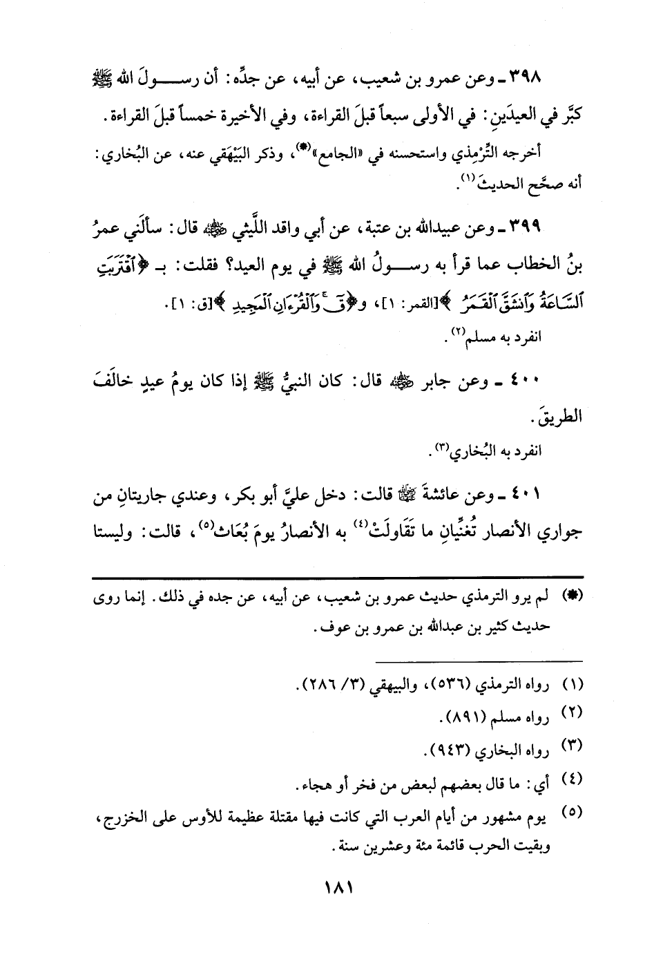 398 - وعن عمرو بن شعيب، عن أبيه، عن جدِّه: أن رسولَ اللَّه - صلى اللَّه عليه وسلم- كبَّر في العيدَينِ: في الأولى سبعًا قبلَ القراءة، وفي الأخيرة خمسًا قبلَ القراءة.