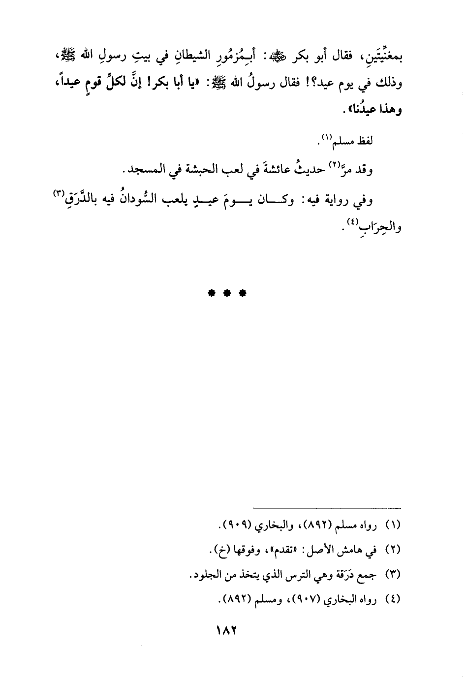 بمغنِّيتَينِ، فقال أبو بكر -رضي اللَّه عنه-: أبِمُزمُورِ الشيطانِ في بيتِ رسولِ اللَّه -صلى اللَّه عليه وسلم-، وذلك في يوم عيد؟! فقال رسولُ اللَّه -صلى اللَّه عليه وسلم-: "يا أبا بكر! إنَّ لكلِّ قومٍ عيدًا، وهذا عيدُنا".