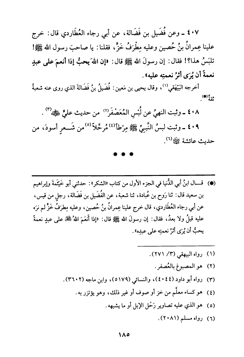 (*) قال ابنُ أبي الدُّنيا في الجزء الأول من كتاب "الشكر": حدثني أبو خَيْثَمةَ وإبراهيم بن سعيد قال: ثنا رَوح بن عُبادة، ثنا شعبة، عن الفُضَيل بن فَضَالة، رجلٍ من قيس، عن أبي رجاء العُطَاردي، قال خرج علينا عِمرانُ بنُ حُصين، وعليه مِطرَفُ خَزٍّ لم نرَه عليه قبلُ ولا بعدُ، فقال: إن رسولَ اللَّه -صلى اللَّه عليه وسلم- قال: "إذا أَنعَمَ اللَّهُ عز وجل على عبدٍ نعمةً يحبُّ أن يُرَى أثرُ نعمتِه على عبدِه".