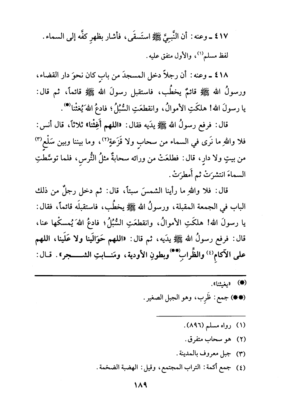 418 - وعنه: أن رجلًا دخل المسجدَ من بابٍ كان نحوَ دار القضاء، ورسولُ اللَّه -صلى اللَّه عليه وسلم- قائمٌ يخطُب، فاستقبل رسولَ اللَّه -صلى اللَّه عليه وسلم- قائمًا، ثم قال: يا رسولَ اللَّه! هلكَتِ الأموالُ، وانقطعَتِ السُّبُلُ؛ فادعُ اللَّهَ يُغثْنا (*).