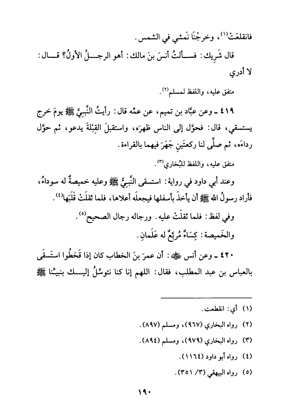 419 - وعن عبَّاد بن تميم، عن عمِّه قال: رأيتُ النَّبِيَّ -صلى اللَّه عليه وسلم- يومَ خرج يستسقي، قال: فحوَّل إلى الناس ظهرَه، واستقبلَ القِبْلةَ يدعو، ثم حوَّل رداءَه، ثم صلَّى لنا ركعتَينِ جَهَرَ فيهما بالقراءة.