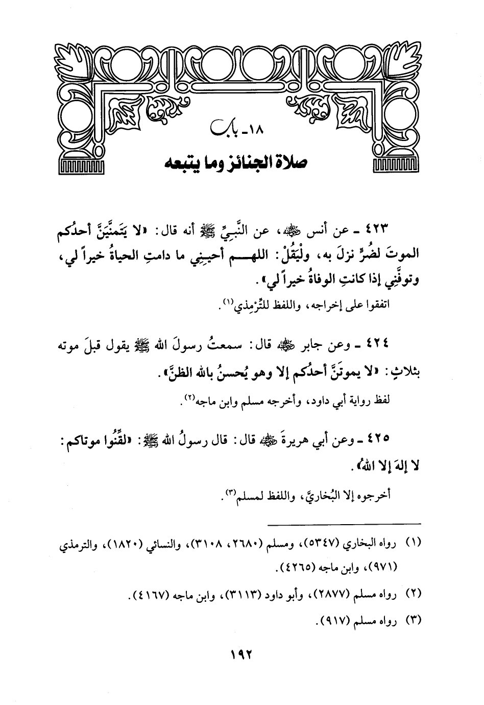 425 - وعن أبي هريرةَ -رضي اللَّه عنه- قال: قال رسولُ اللَّه -صلى اللَّه عليه وسلم-: "لقِّنُوا موتاكم: لا إلهَ إلا اللَّه".