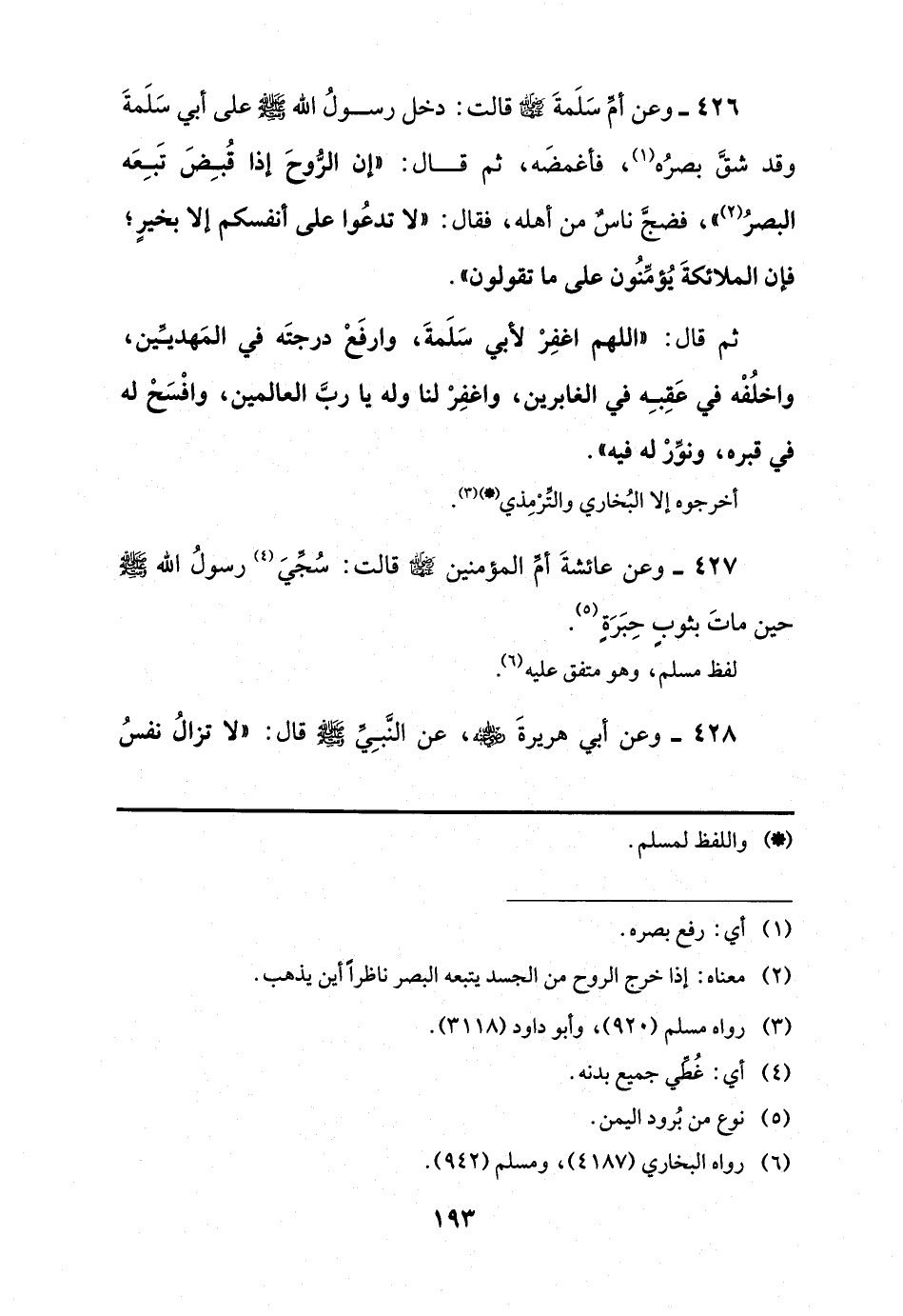 426 - وعن أمِّ سَلَمةَ -رضي اللَّه عنها- قالت: دخل رسولُ اللَّه -صلى اللَّه عليه وسلم- على أبي سَلَمةَ وقد شقَّ بصرُه (¬1)، فأغمضَه، ثم قال: "إن الرُّوحَ إذا قُبِضَ تَبِعَه البصرُ (¬2) "، فضجَّ ناس من أهله، فقال: "لا تدعُوا على أنفسكم إلا بخيرٍ؛ فإن الملائكةَ يُؤمِّنُون على ما تقولون".