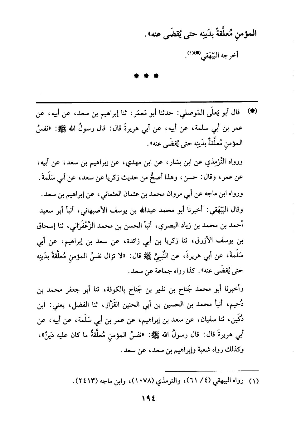 ورواه التِّرْمِذي عن ابن بشار، عن ابن مهدي، عن إبراهيم بن سعد، عن أبيه، عن عمر، وقال: حسن، وهذا أصحُّ من حديث زكريا عن سعد، عن أبي سَلَمةَ. ورواه ابن ماجه عن أبي مروان محمد بن عثمان العثماني، عن إبراهيم بن سعد. وقال البَيْهَقي: أخبرنا أبو محمد عبد اللَّه بن يوسف الأصبهاني، أنبأ أبو سعيد أحمد بن محمد بن زياد البصري، أنبأ الحسن بن محمد الزَّعْفَرَاني، ثنا إسحاق بن يوسف الأزرق، ثنا زكريا بن أبي زائدة، عن سعد بن إبراهيم، عن أبي سَلَمةَ، عن أبي هريرةَ، عن النَّبِيِّ -صلى اللَّه عليه وسلم- قال: "لا تزال نفسُ المؤمنِ مُعلَّقةً بدَينِه حتى يُقضَى عنه". كذا رواه جماعة عن سعد.