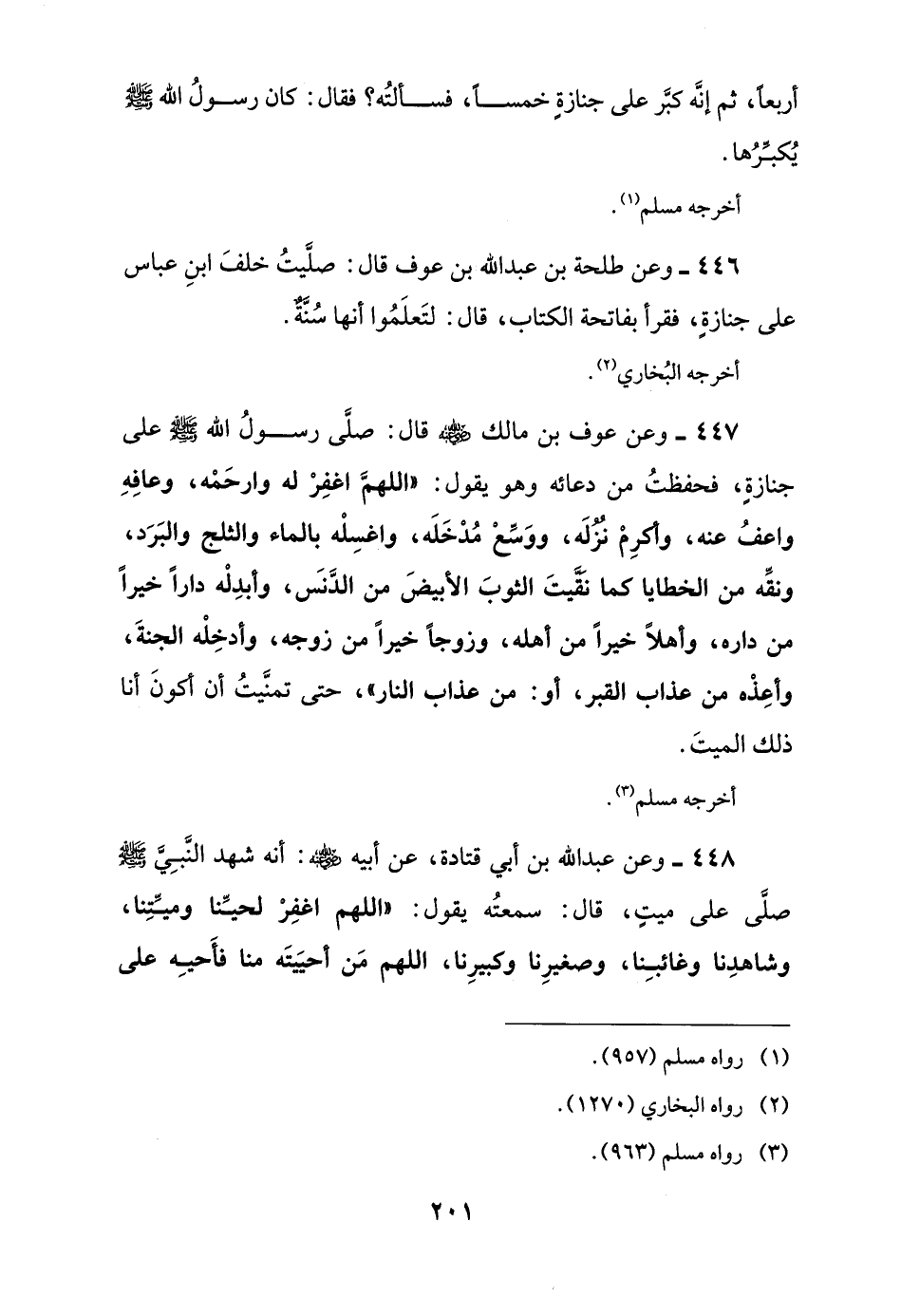 446 - وعن طلحة بن عبد اللَّه بن عوف قال: صلَّيتُ خلفَ ابنِ عباس على جنازةٍ، فقرأ بفاتحة الكتاب، قال: لتَعلَمُوا أنها سنَّةٌ.
