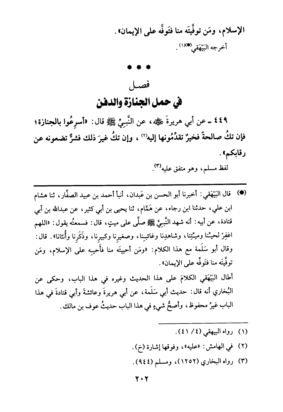 449 - عن أبي هريرةَ -رضي اللَّه عنه-، عن النَّبِيِّ -صلى اللَّه عليه وسلم- قال: "أسرِعُوا بالجنازة؛ فإن تكُ صالحةً فخيرٌ تقدِّمُونها إليه (¬2)، وإن تكُ غيرَ ذلك فشرٌّ تضعونه عن رقابكم".