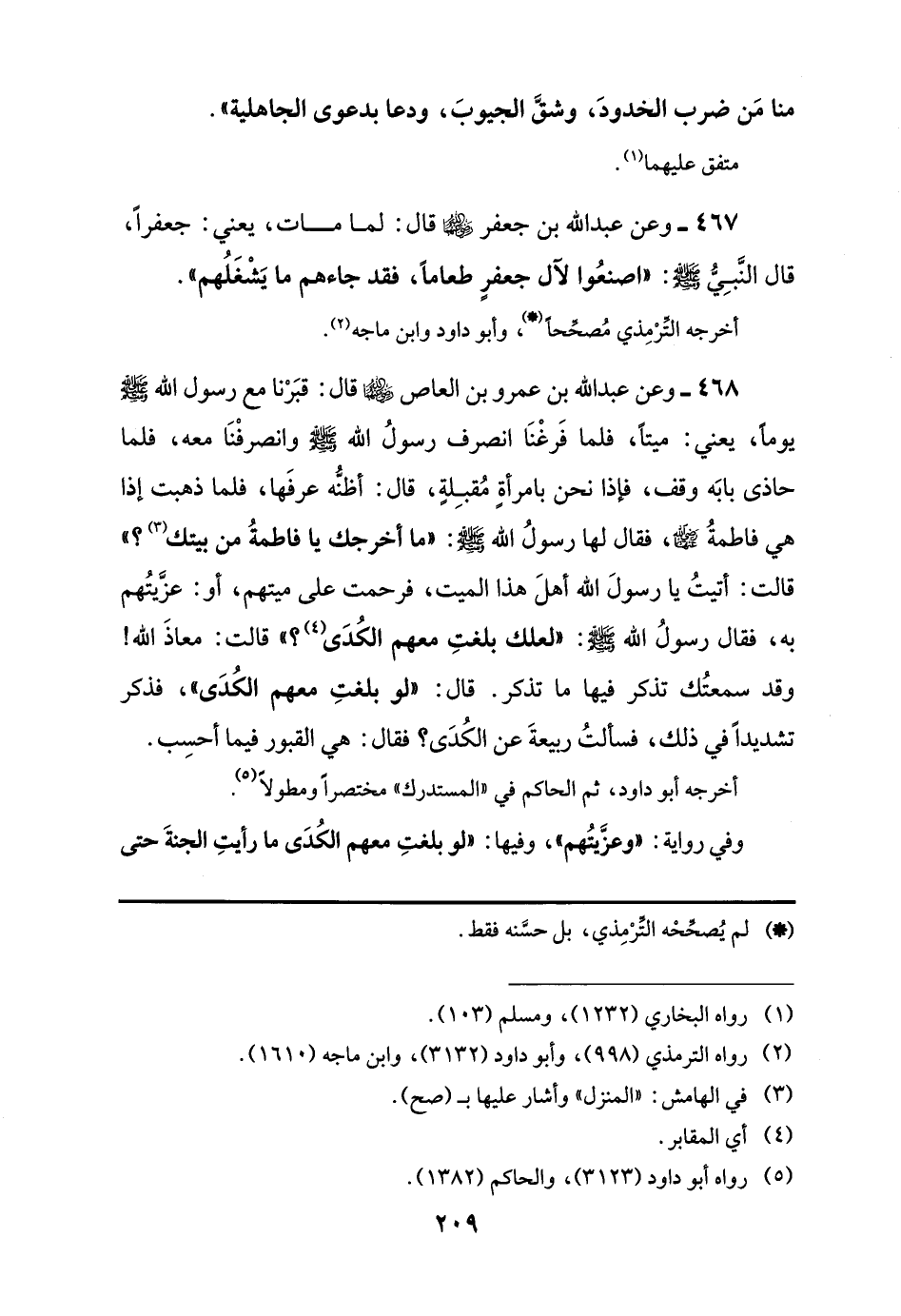467 - وعن عبد اللَّه بن جعفر -رضي اللَّه عنهما- قال: لما مات، يعني: جعفرًا، قال النَّبِيُّ -صلى اللَّه عليه وسلم-: "اصنعُوا لآل جعفرٍ طعامًا، فقد جاءهم ما يَشْغَلُهم".