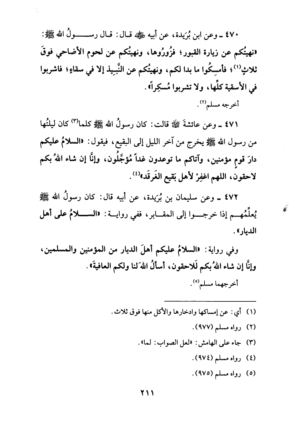 472 - وعن سليمان بن بُرَيدة، عن أبيه قال: كان رسولُ اللَّه -صلى اللَّه عليه وسلم- يُعلِّمُهم إذا خرجوا إلى المقابر، ففي رواية: "السلامُ على أهل الديار".