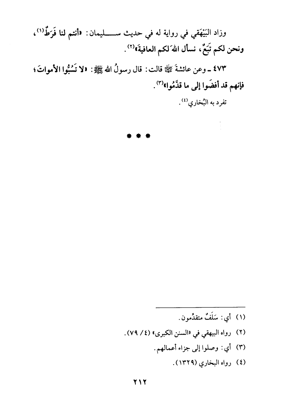 473 - وعن عائشةَ -رضي اللَّه عنها- قالت: قال رسولُ اللَّه -صلى اللَّه عليه وسلم-: "لا تَسُبُّوا الأمواتَ؛ فإنهم قد أفضَوا إلى ما قدَّمُوا" (¬3).