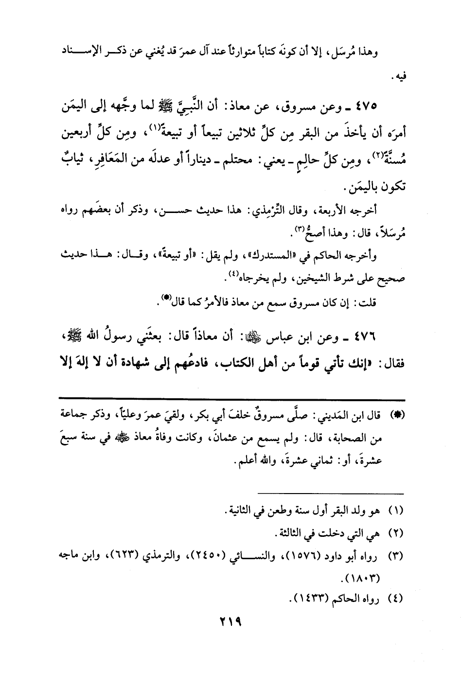 475 - وعن مسروق، عن معاذ: أن النَّبِيَّ -صلى اللَّه عليه وسلم- لما وجَّهه إلى اليمَن أمرَه أن يأخذَ من البقر مِن كلِّ ثلاثين تبيعًا أو تبيعةً (¬1)، ومِن كلٍّ أربعين مُسنَّةً (¬2)، ومِن كل حالِمٍ -يعني: محتلم- دينارًا أو عدلَه من المَعَافِرِ، ثيابٌ تكون باليمَن.