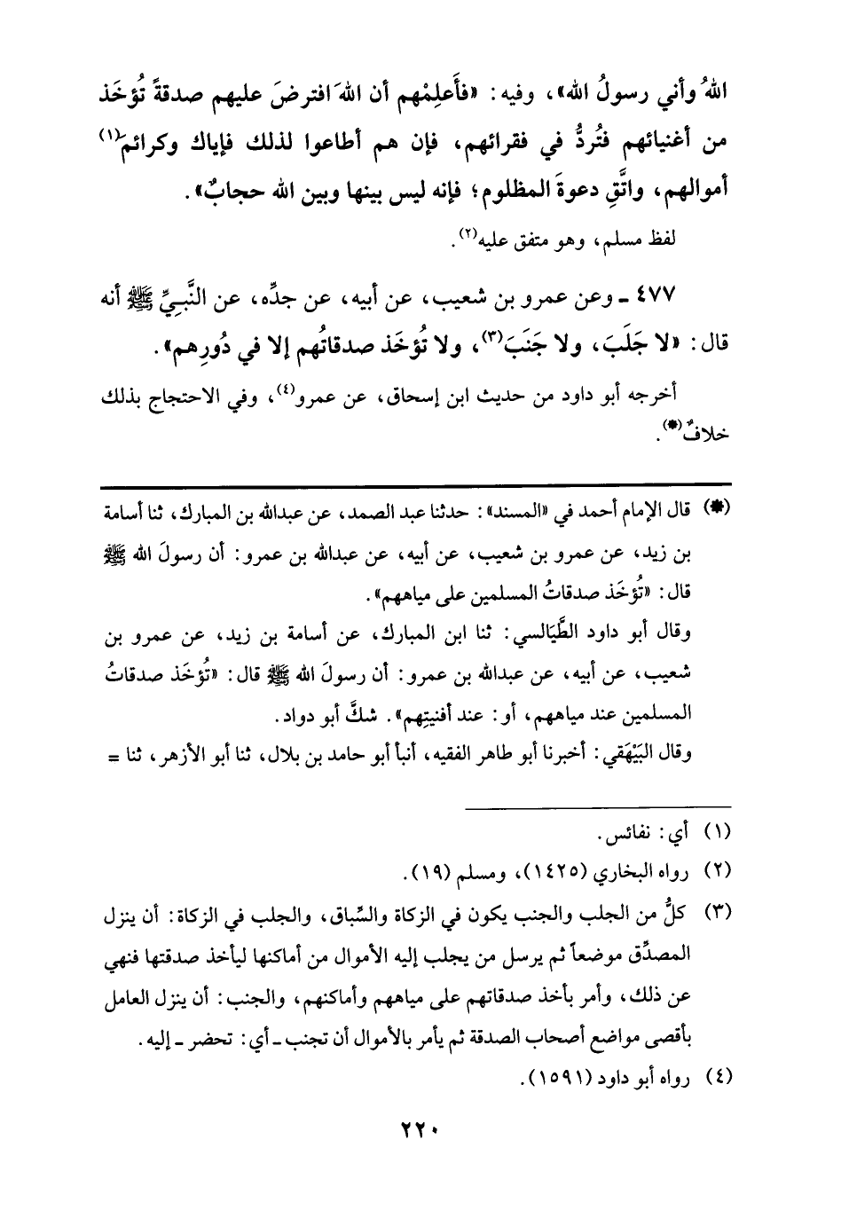 477 - وعن عمرو بن شعيب، عن أبيه، عن جدِّه، عن النَّبِيِّ -صلى اللَّه عليه وسلم- أنه قال: "لا جَلَبَ، ولا جَنَبَ (¬3)، ولا تُؤخَذ صدقاتُهم إلا في دُورِهم".
