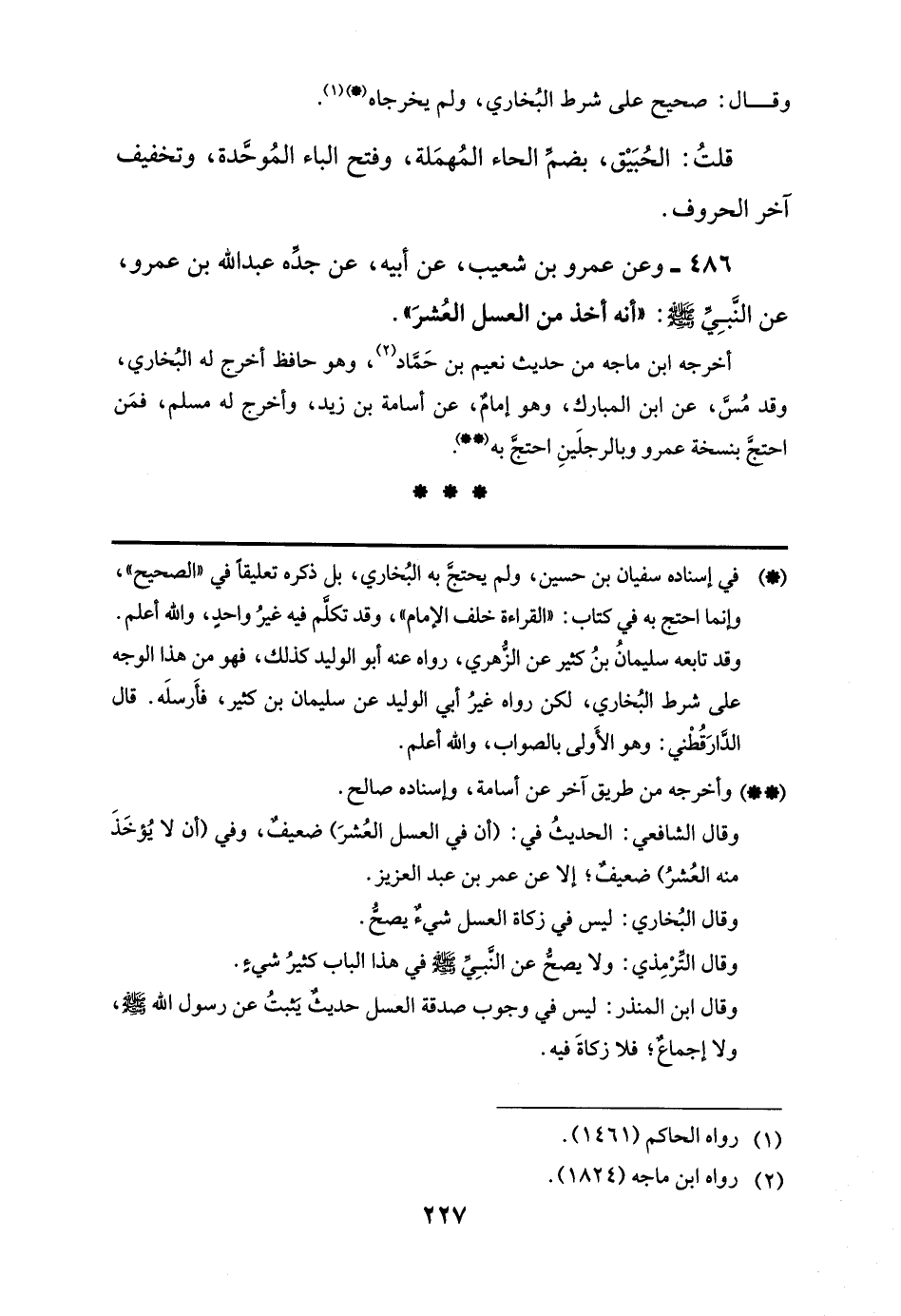 486 - وعن عمرو بن شعيب، عن أبيه، عن جدِّه عبد اللَّه بن عمرو، عن النَّبيِّ -صلى اللَّه عليه وسلم-: "أنه أخذ من العسل العُشرَ".