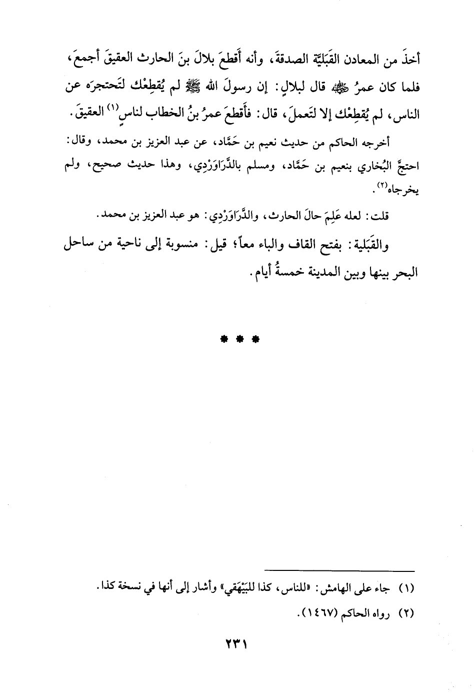 أخذَ من المعادن القَبَليَّة الصدقةَ، وأنه أَقطعَ بلالَ بنَ الحارث العقيقَ أجمعَ، فلما كان عمرُ -رضي اللَّه عنه- قال لبلالٍ: إن رسولَ اللَّه -صلى اللَّه عليه وسلم- لم يُقطِعْك لتَحتجرَه عن الناس، لم يُقطِعْك إلا لتَعملَ، قال: فأَقطعَ عمرُ بنُ الخطاب لناسٍ (¬1) العقيقَ.