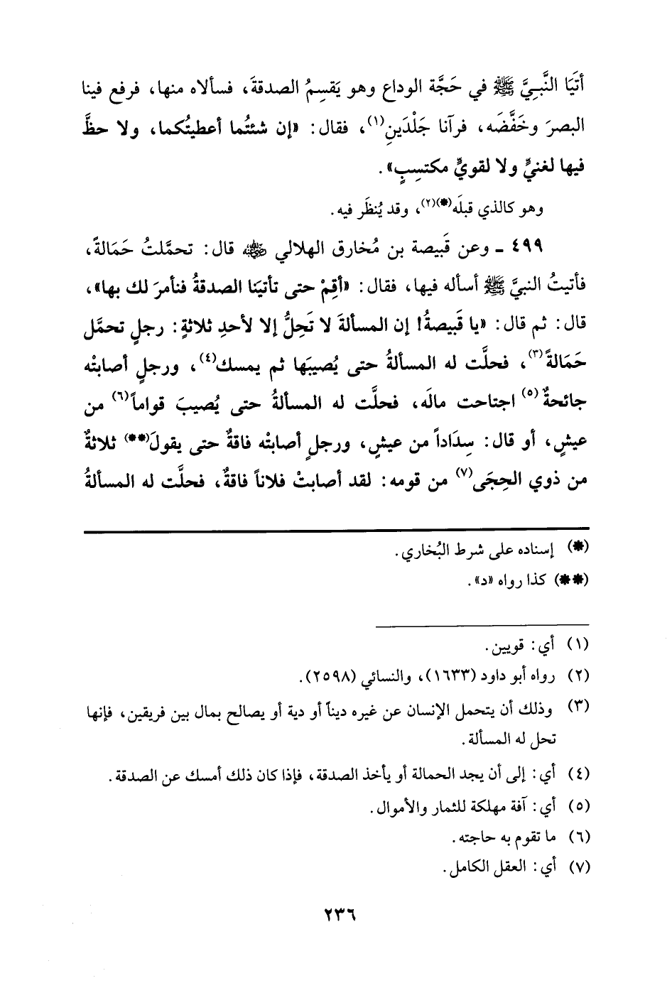 499 - وعن قَبيصة بن مُخارق الهلالي -رضي اللَّه عنه- قال: تحمَّلتُ حَمَالةً، فأتيتُ النبيَّ -صلى اللَّه عليه وسلم- أسأله فيها، فقال: "أقِمْ حتى تأتيَنا الصدقةُ فنأمرَ لك بها"، قال: ثم قال: "يا قَبيصةُ! إن المسألةَ لا تَحِلُّ إلا لأحدِ ثلاثةٍ: رجلٍ تحمَّل حَمَالةً (¬3)، فحلَّت له المسألةُ حتى يُصيبَها ثم يمسك (¬4)، ورجلٍ أصابتْه جائحةٌ (¬5) اجتاحت مالَه، فحلَّت له المسألةُ حتى يُصيبَ قوامًا (¬6) من عيشٍ، أو قال: سِدَادًا من عيشٍ، ورجلٍ أصابتْه فاقةٌ حتى يقولَ (**) ثلاثةٌ من ذوي الحِجَى (¬7) من قومه: لقد أصابتْ فلانًا فاقةٌ، فحلَّت له المسألةُ