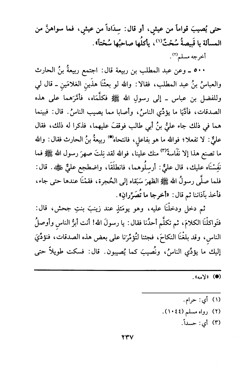 500 - وعن عبد المطلب بن ربيعة قال: اجتمع ربيعةُ بنُ الحارث والعباسُ بنُ عبد المطلب، فقالا: واللَّه لو بعثْنَا هذَينِ الغلامَينِ -قال لي وللفضل بن عباس- إلى رسولِ اللَّه -صلى اللَّه عليه وسلم- فكلَّمَاه، فأمَّرَهما على هذه الصدقات، فأدَّيَا ما يؤدِّي الناسُ، وأصابا مما يصيب الناسُ. قال: فبينما هما في ذلك جاء عليُّ بنُ أبي طالب فوقفَ عليهما، فذكرا له ذلك، فقال عليٌّ: لا تفعلا؛ فواللَّه ما هو بفاعلٍ، فانتحاه (*) ربيعةُ بنُ الحارث فقال: واللَّه ما تصنع هذا إلا نَفَاسةً (¬3) منك علينا، فواللَّه لقد نِلتَ صهرَ رسول اللَّه -صلى اللَّه عليه وسلم- فما نَفِسْنَاه عليك، قال عليٌّ: أرسِلُوهما، فانطلَقَا، واضطجع عليٌّ -رضي اللَّه عنه-. قال: فلما صلَّى رسولُ اللَّه -صلى اللَّه عليه وسلم- الظهرَ سَبَقاه إلى الحُجرة، فقمْنَا عندها حتى جاء، فأخذ بآذاننا ثم قال: "أخرجا ما تُصَرِّرانِ".