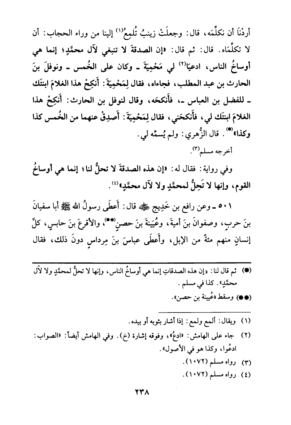 (*) ثم قال لنا: "إن هذه الصدقاتِ إنما هي أوساخُ الناس، وإنها لا تحلُّ لمحمَّدٍ ولا لآل محمَّدٍ". كذا في مسلم.