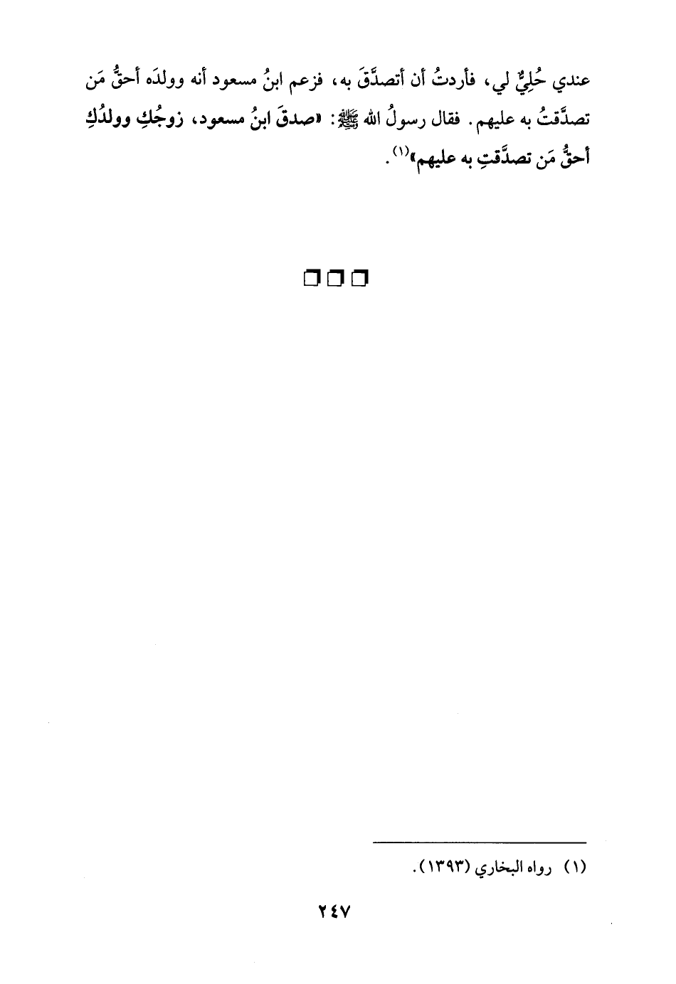 عندي حُلِيٌّ لي، فأردتُ أن أتصدَّقَ به، فزعم ابنُ مسعود أنه وولدَه أحقُّ مَن تصدَّقتُ به عليهم. فقال رسولُ اللَّه -صلى اللَّه عليه وسلم-: "صدقَ ابنُ مسعود، زوجُكِ وولدُكِ أحقُّ مَن تصدَّقتِ به عليهم" (¬1).