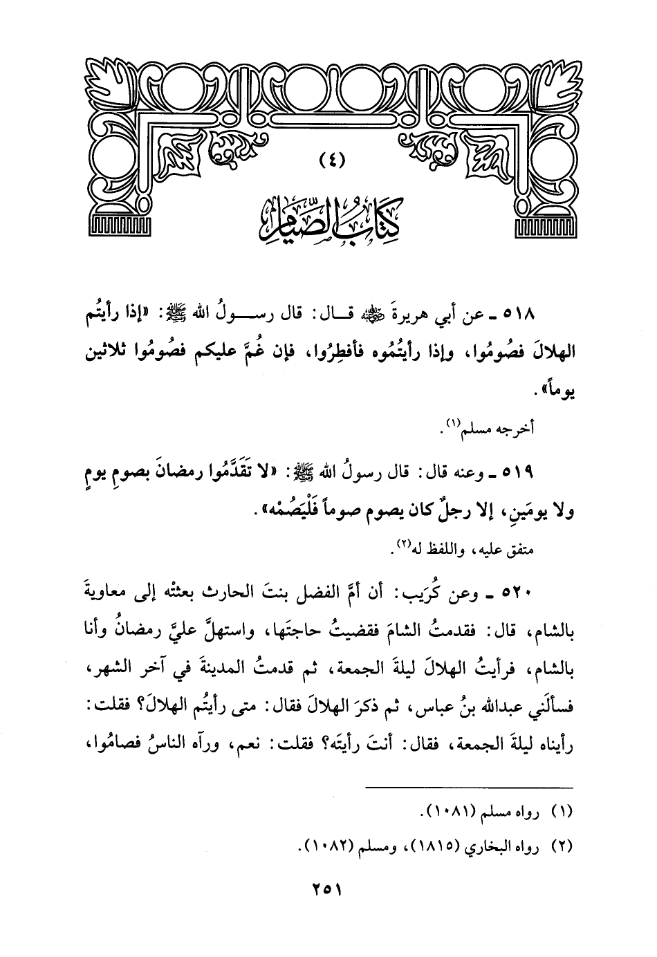 518 - عن أبي هريرةَ -رضي اللَّه عنه- قال: قال رسولُ اللَّه -صلى اللَّه عليه وسلم-: "إذا رأيتُم الهلالَ فصُومُوا، وإذا رأيتُمُوه فأفطِرُوا، فإن غُمَّ عليكم فصُومُوا ثلاثين يومًا".