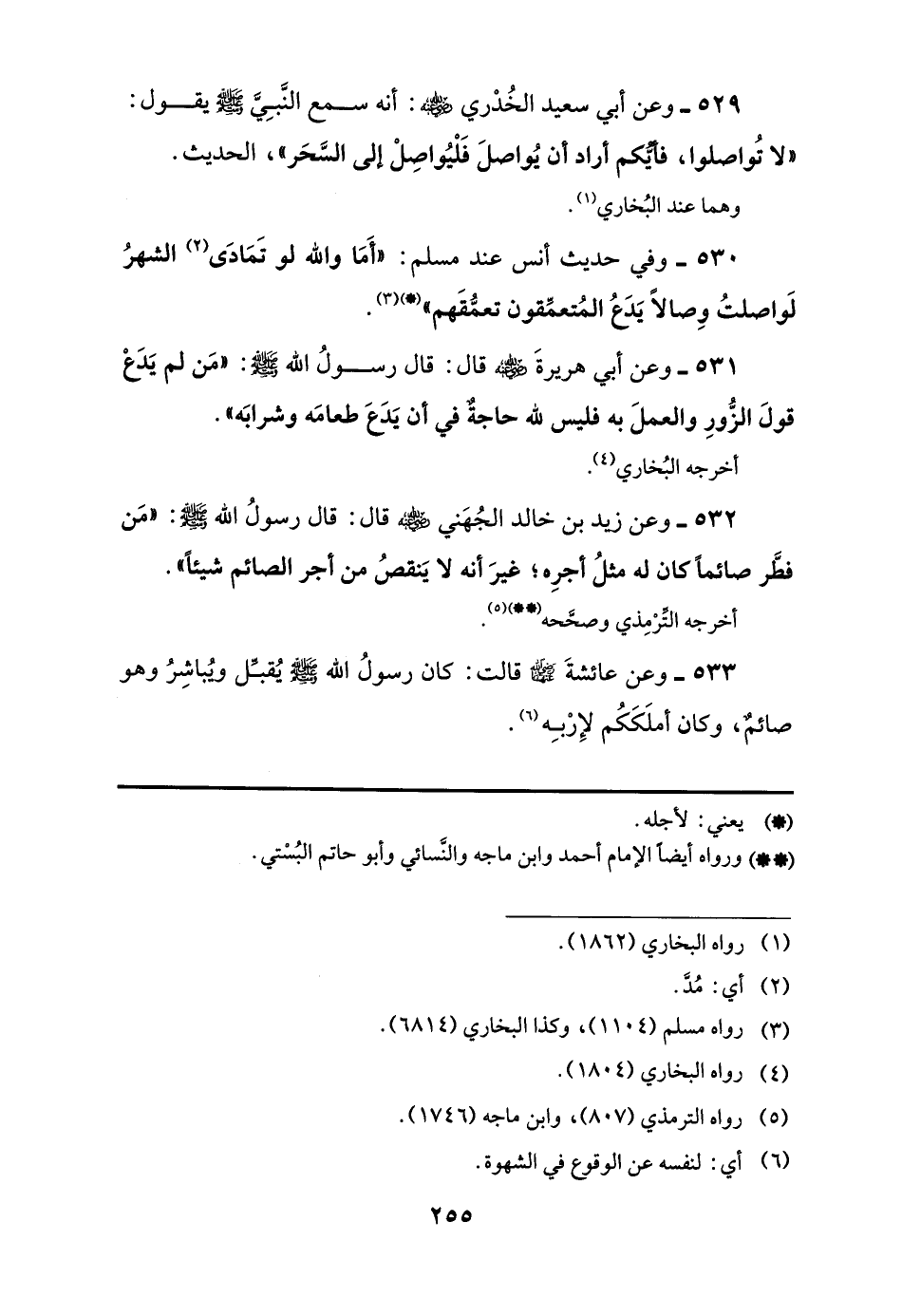 529 - وعن أبي سعيد الخُدْري -رضي اللَّه عنه-: أنه سمع النَّبِيَّ -صلى اللَّه عليه وسلم- يقول: "لا تُواصلوا، فأيَّكم أراد أن يُواصلَ فَلْيُواصِلْ إلى السَّحَر"، الحديث.