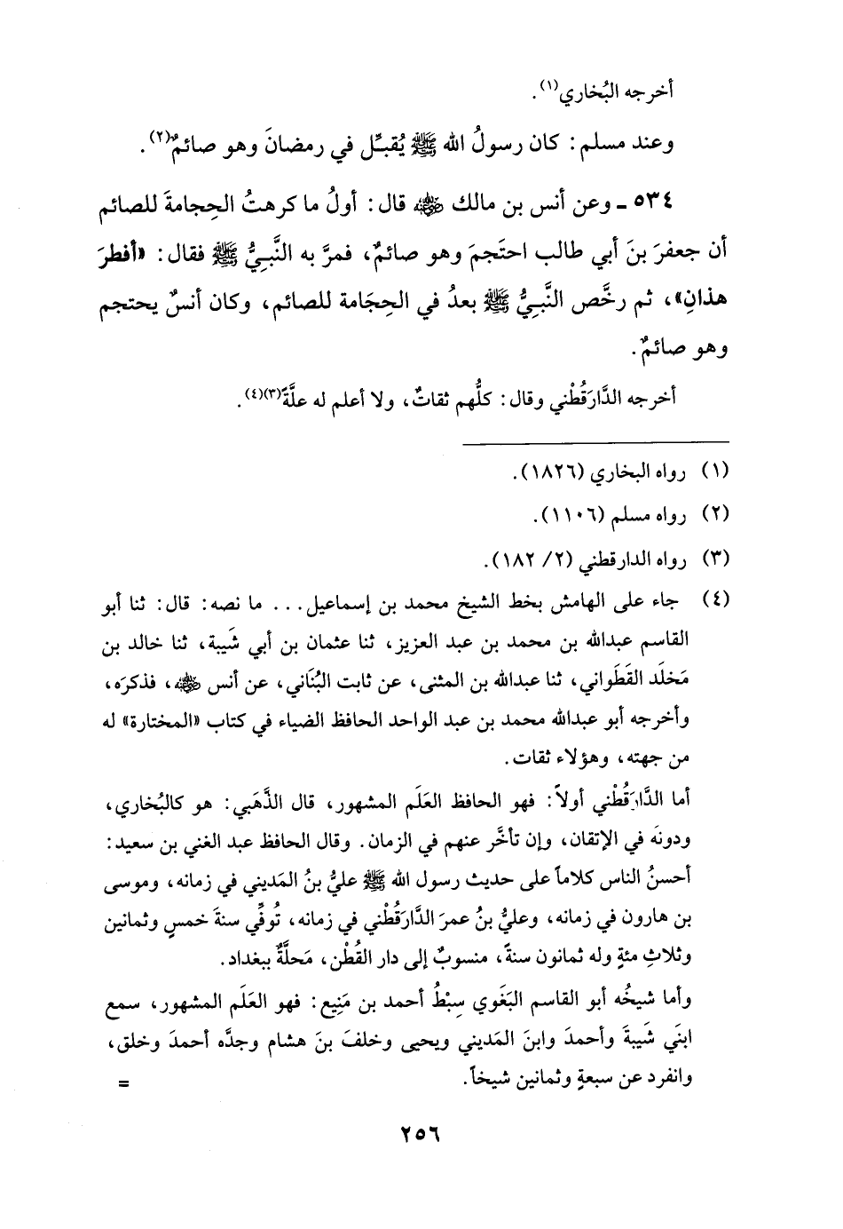 534 - وعن أنس بن مالك -رضي اللَّه عنه- قال: أولُ ما كرهتُ الحِجامةَ للصائم أن جعفرَ بنَ أبي طالب احتَجمَ وهو صائمٌ، فمرَّ به النَّبِيُّ -صلى اللَّه عليه وسلم- فقال: "أفطرَ هذانِ"، ثم رخَّص النَّبِيُّ -صلى اللَّه عليه وسلم- بعدُ في الحِجَامة للصائم، وكان أنسٌ يحتجم وهو صائمٌ.