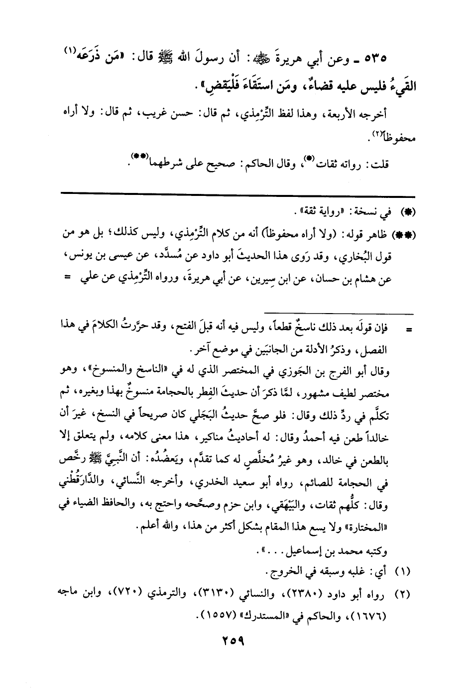 535 - وعن أبي هريرةَ -رضي اللَّه عنه-: أن رسولَ اللَّه -صلى اللَّه عليه وسلم- قال: "مَن ذَرَعَه (¬1) القَيءُ فليس عليه قضاءٌ، ومَن استَقَاءَ فَلْيَقضِ".