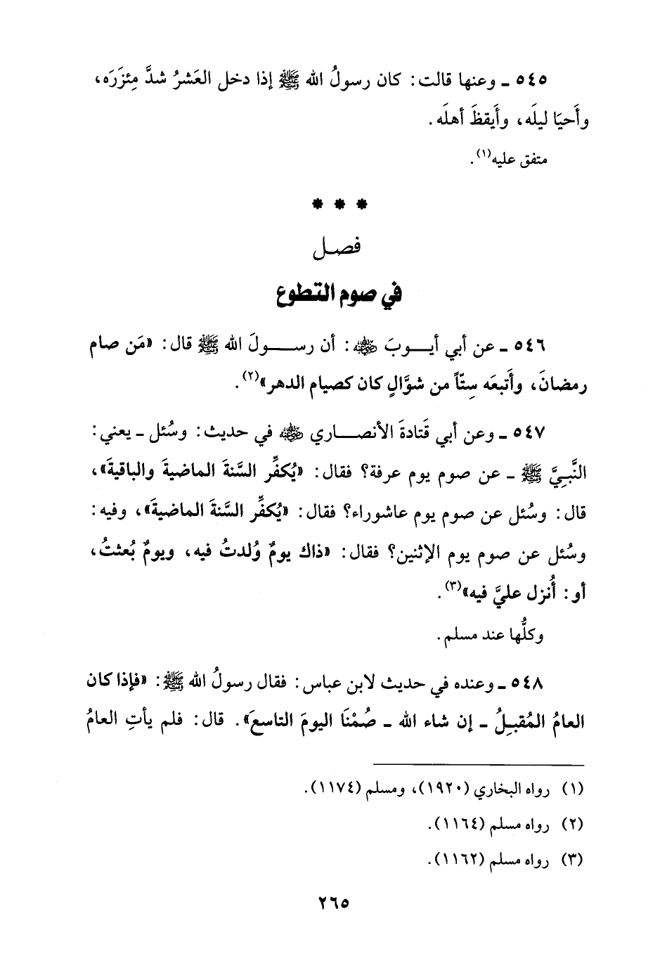 546 - عن أبي أيوبَ -رضي اللَّه عنه-: أن رسولَ اللَّه -صلى اللَّه عليه وسلم- قال: "مَن صام رمضانَ، وأَتبعَه سِتًّا من شوَّالٍ كان كصيام الدهر" (¬2).