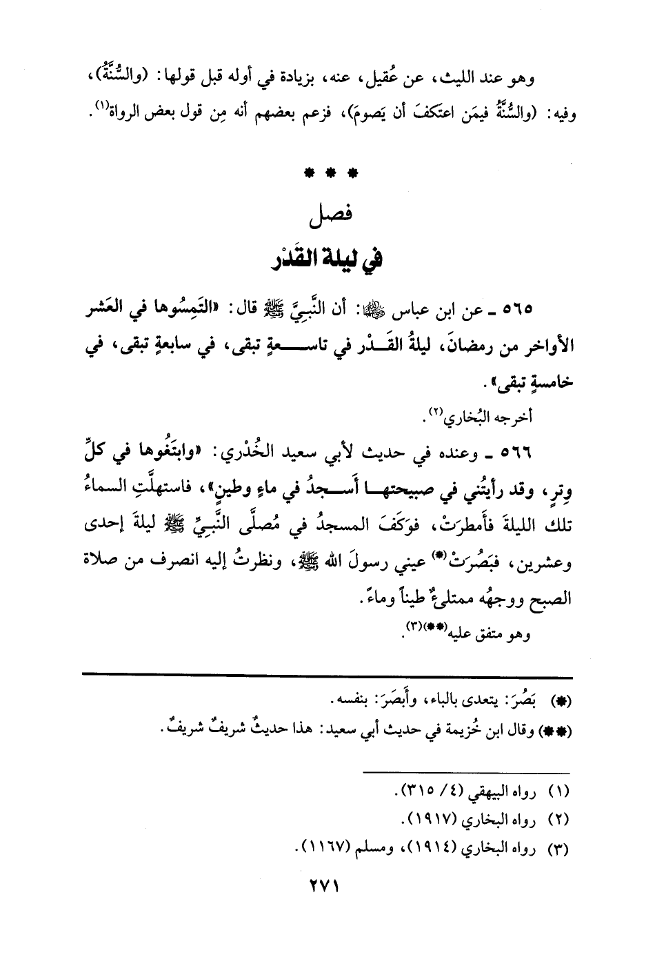 566 - وعنده في حديث لأبي سعيد الخُدْري: "وابتَغُوها في كلِّ وِترٍ، وقد رأيتُني في صبيحتها أَسجدُ في ماءٍ وطينٍ"، فاستهلَّتِ السماءُ تلك الليلةَ فأَمطرَتْ، فوَكَفَ المسجدُ في مُصلَّى النَّبِيِّ -صلى اللَّه عليه وسلم- ليلةَ إحدى وعشرين، فبَصُرَتْ (*) عيني رسولَ اللَّه -صلى اللَّه عليه وسلم-، ونظرتُ إليه انصرف من صلاة الصبح ووجهُه ممتلئٌ طينًا وماءً.