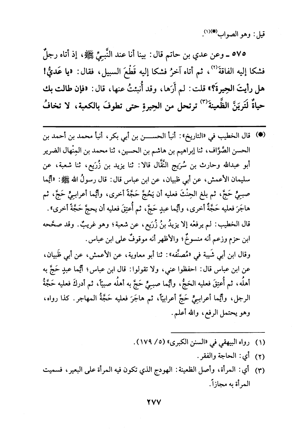 575 - وعن عدي بن حاتم قال: بينا أنا عند النَّبِيِّ -صلى اللَّه عليه وسلم-، إذ أتاه رجلٌ فشكا إليه الفاقةَ (¬2)، ثم أتاه آخرُ فشكا إليه قَطْعَ السبيل، فقال: "يا عَديُّ! هل رأيتَ الحِيرةَ؟ " قلت: لم أَرَها، وقد أُنبئتُ عنها، قال: "فإن طالت بك حياةٌ لتريَنَّ الظَّعينةَ (¬3) ترتحل من الحِيرةِ حتى تطوفَ بالكعبة، لا تخافُ