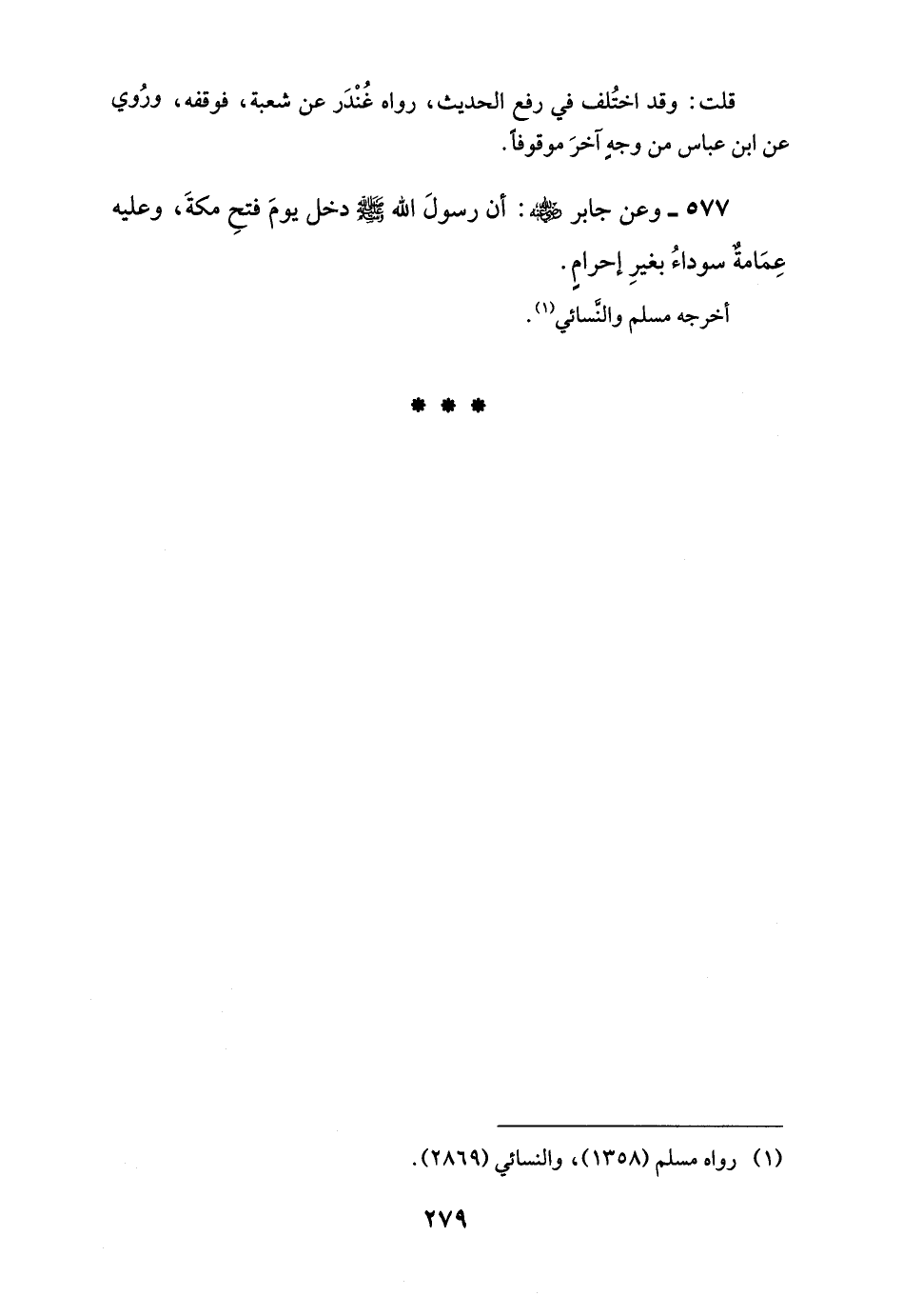 577 - وعن جابر -رضي اللَّه عنه-: أن رسولَ اللَّه -صلى اللَّه عليه وسلم- دخل يومَ فتحِ مكةَ، وعليه عِمَامةٌ سوداءُ بغيرِ إحرامٍ.