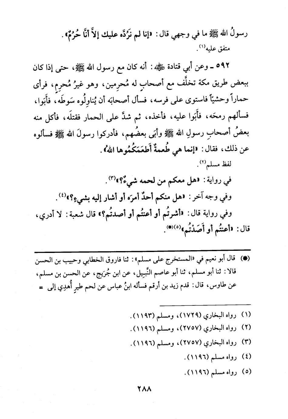 592 - وعن أبي قتادة -رضي اللَّه عنه-: أنه كان مع رسول اللَّه -صلى اللَّه عليه وسلم-، حتى إذا كان ببعض طريق مكة تخلَّف مع أصحابٍ له مُحرِمين، وهو غيرُ مُحرِمٍ، فرأى حمارًا وحشيًّا فاستوى على فرسه، فسأل أصحابَه أن يُناوِلُوه سَوطَه، فأَبَوا، فسألهم رمحَه، فأَبَوا عليه، فأخذه، ثم شدَّ على الحمار فقتلَه، فأكل منه بعضُ أصحابِ رسولِ اللَّه -صلى اللَّه عليه وسلم- وأبَى بعضُهم، فأدركوا رسولَ اللَّه -صلى اللَّه عليه وسلم- فسألوه عن ذلك، فقال: "إنما هي طُعمةٌ أَطعَمَكُمُوها اللَّه".