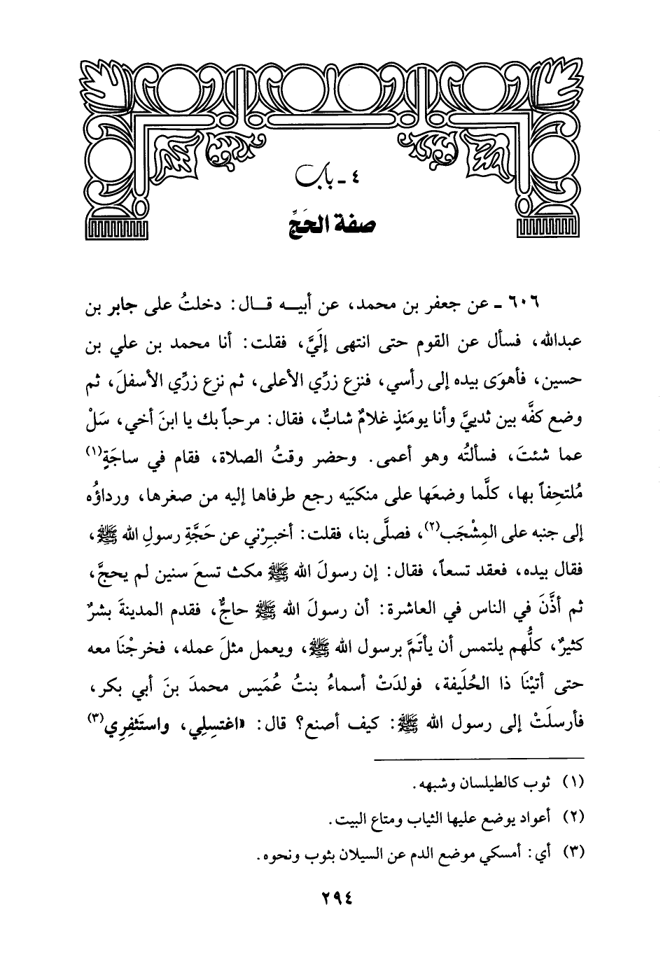 606 - عن جعفر بن محمد، عن أبيه قال: دخلتُ على جابر بن عبد اللَّه، فسأل عن القوم حتى انتهى إلَيَّ، فقلت: أنا محمد بن علي بن حسين، فأهوَى بيده إلى رأسي، فنزع زرِّي الأعلى، ثم نزع زرِّي الأسفلَ، ثم وضع كفَّه بين ثدييَّ وأنا يومَئذٍ غلامٌ شابٌّ، فقال: مرحبًا بك يا ابنَ أخي، سَلْ عما شئتَ، فسألتُه وهو أعمى. وحضر وقتُ الصلاة، فقام في ساجَةٍ (¬1) مُلتحِفًا بها، كلَّما وضعَها على منكبَيه رجع طرفاها إليه من صغرها، ورداؤُه إلى جنبه على المِشْجَب (¬2)، فصلَّى بنا، فقلت: أخبِرْني عن حَجَّةِ رسولِ اللَّه -صلى اللَّه عليه وسلم-، فقال بيده، فعقد تسعًا، فقال: إن رسولَ اللَّه -صلى اللَّه عليه وسلم- مكث تسعَ سنين لم يحجَّ، ثم أذَّنَ في الناس في العاشرة: أن رسولَ اللَّه -صلى اللَّه عليه وسلم- حاجٌّ، فقدم المدينةَ بشرٌ كثيرٌ، كلُّهم يلتمس أن يأتَمَّ برسول اللَّه -صلى اللَّه عليه وسلم-، ويعمل مثلَ عمله، فخرجْنَا معه حتى أتيْنَا ذا الحُلَيفة، فولدَتْ أسماءُ بنتُ عُمَيس محمدَ بنَ أبي بكر، فأرسلَتْ إلى رسول اللَّه -صلى اللَّه عليه وسلم-: كيف أصنع؟ قال: "اغتسِلِي، واستَثفِرِي (¬3)