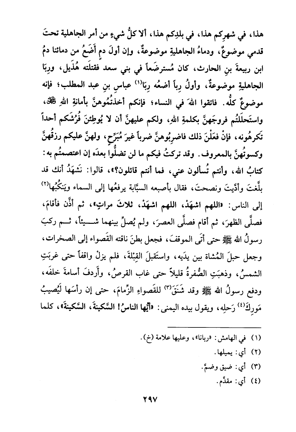 هذا، في شهرِكم هذا، في بلدِكم هذا، ألا كلُّ شيءٍ من أمر الجاهلية تحتَ قدمي موضوعٌ، ودماءُ الجاهليةِ موضوعةٌ، وإن أولَ دمٍ أَضَعُ من دمائنا دمُ ابن ربيعةَ بنِ الحارث، كان مُسترضَعًا في بني سعد فقتلَته هُذَيل، ورِبَا الجاهليةِ موضوعةٌ، وأولُ رِبًا أضعُه رِبَا (¬1) عباسِ بنِ عبد المطلب؛ فإنه موضوعٌ كلُّه. فاتقوا اللَّهَ في النساء؛ فإنكم أخذتُمُوهنَّ بأمانةِ اللَّهِ عز وجل، واستَحلَلتُم فروجَهنَّ بكلمةِ اللَّهِ، ولكم عليهنَّ أن لا يُوطِئنَ فُرُشَكم أحدًا تَكرهُونه، فإنْ فعَلْنَ ذلك فاضرِبُوهنَّ ضربًا غيرَ مُبَرِّحٍ، ولهنَّ عليكم رزقُهنَّ وكسوتُهنَّ بالمعروف. وقد تركتُ فيكم ما لن تضلُّوا بعدَه إن اعتصمتُم به: كتابُ اللَّه، وأنتم تُسألون عني، فما أنتم قائلون؟ "، قالوا: نشَهَدُ أنك قد بلَّغتَ وأدَّيتَ ونصحتَ، فقال بأصبعه السبَّابة يرفعُها إلى السماء ويَنكُبُها (¬2) إلى الناس: "اللهم اشهَدْ، اللهم اشهَدْ، ثلاثَ مراتٍ"، ثم أذَّن فأقامَ، فصلَّى الظهرَ، ثم أقام فصلَّى العصرَ، ولم يُصلِّ بينهما شيئًا، ثم ركبَ رسولُ اللَّه -صلى اللَّه عليه وسلم- حتى أتَى الموقفَ، فجعل بطنَ ناقته القَصواء إلى الصخرات، وجعل حبلَ المُشاة بين يدَيه، واستَقبلَ القِبْلةَ، فلم يزلْ واقفًا حتى غربَتِ الشمسُ، وذهبَتِ الصُّفرةُ قليلًا حتى غاب القرصُ، وأَردفَ أسامةَ خلفَه، ودفع رسولُ اللَّه -صلى اللَّه عليه وسلم- وقد شَنَقَ (¬3) للقَصواءِ الزِّمامَ، حتى إن رأسَها لَيُصيبُ مَورِكَ (¬4) رَحلِه، ويقول بيده اليمنى: "أيُّها الناسُ! السَّكينةَ، السَّكينةَ"، كلما