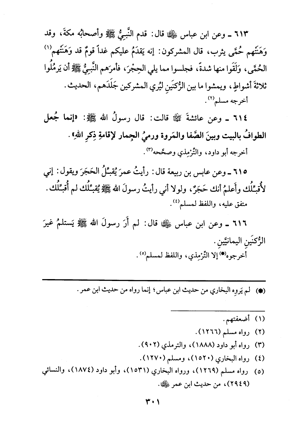 616 - وعن ابن عباس -رضي اللَّه عنهما- قال: لم أَرَ رسولَ اللَّه -صلى اللَّه عليه وسلم- يَستلمُ غيرَ الرُّكنَينِ اليمانيَّينِ.