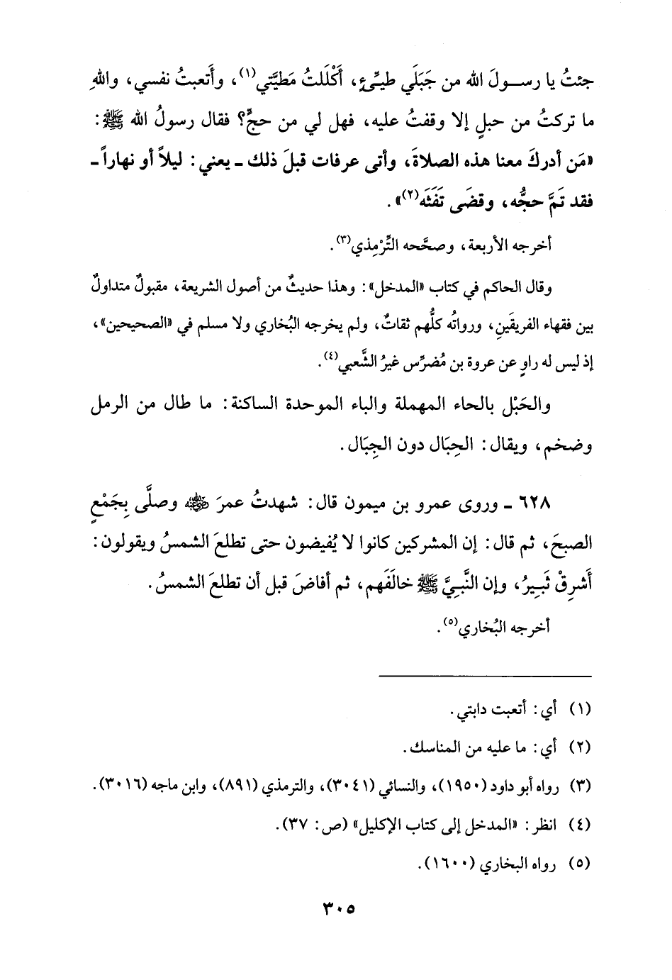 628 - وروى عمرو بن ميمون قال: شهدتُ عمرَ -رضي اللَّه عنه- وصلَّى بِجَمْعٍ الصبحَ، ثم قال: إن المشركين كانوا لا يُفيضون حتى تطلعَ الشمسُ ويقولون: أَشرِقْ ثَبِيرُ، كان النَّبِيَّ -صلى اللَّه عليه وسلم- خالَفَهم، ثم أفاضَ قبل أن تطلعَ الشمسُ.