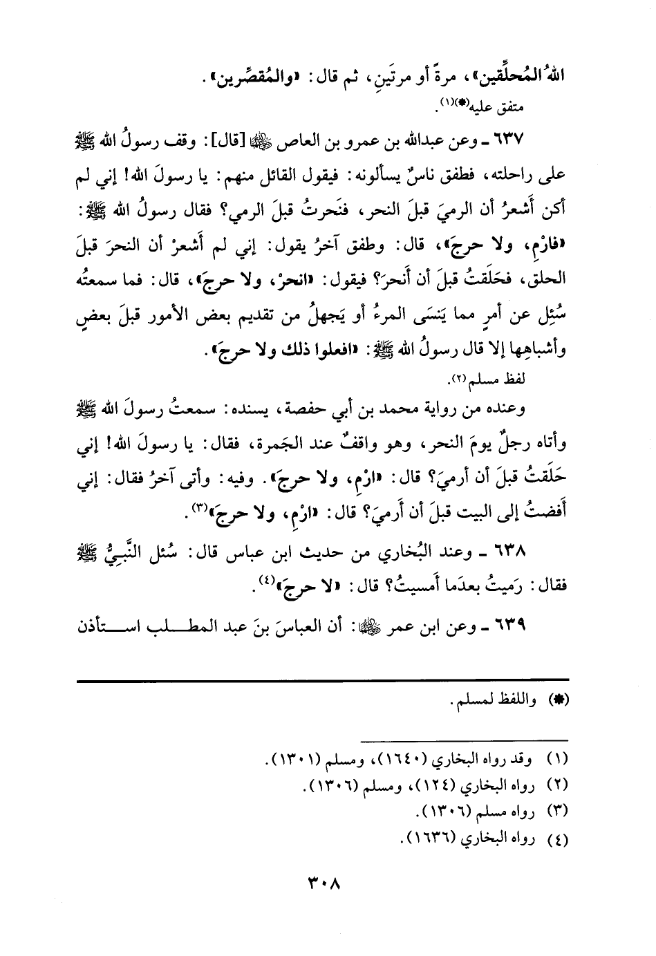 637 - وعن عبد اللَّه بن عمرو بن العاص -رضي اللَّه عنهما-[قال]: وقف رسولُ اللَّه -صلى اللَّه عليه وسلم- على راحلته، فطفق ناسٌ يسألونه: فيقول القائل منهم: يا رسولَ اللَّه! إني لم اكن أَشعرُ أن الرميَ قبلَ النحر، فنَحرتُ قبلَ الرمي؟ فقال رسولُ اللَّه -صلى اللَّه عليه وسلم-: "فارْمِ، ولا حرجَ"، قال: وطفق آخرُ يقول: إني لم أَشعرْ أن النحرَ قبلَ الحلق، فحَلَقتُ قبلَ أن أَنحرَ؟ فيقول: "انحر، ولا حرجَ"، قال: فما سمعتُه سُئِل عن أمر مما يَنسَى المرءُ أو يَجهلُ من تقديم بعض الأمور قبلَ بعضٍ وأشباهِها إلا قال رسولُ اللَّه -صلى اللَّه عليه وسلم-: "افعلوا ذلك ولا حرجَ".