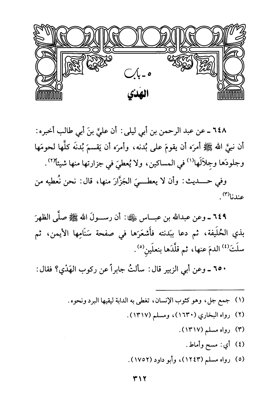 649 - وعن عبد اللَّه بن عباس -رضي اللَّه عنهما-: أن رسولَ اللَّه -صلى اللَّه عليه وسلم- صلَّى الظهرَ بذي الحُلَيفة، ثم دعا ببَدنته فأَشعَرَها في صفحة سَنَامِها الأيمن، ثم سلَتَ (¬4) الدمَ عنها، ثم قلَّدَها بنعلَينِ (¬5).