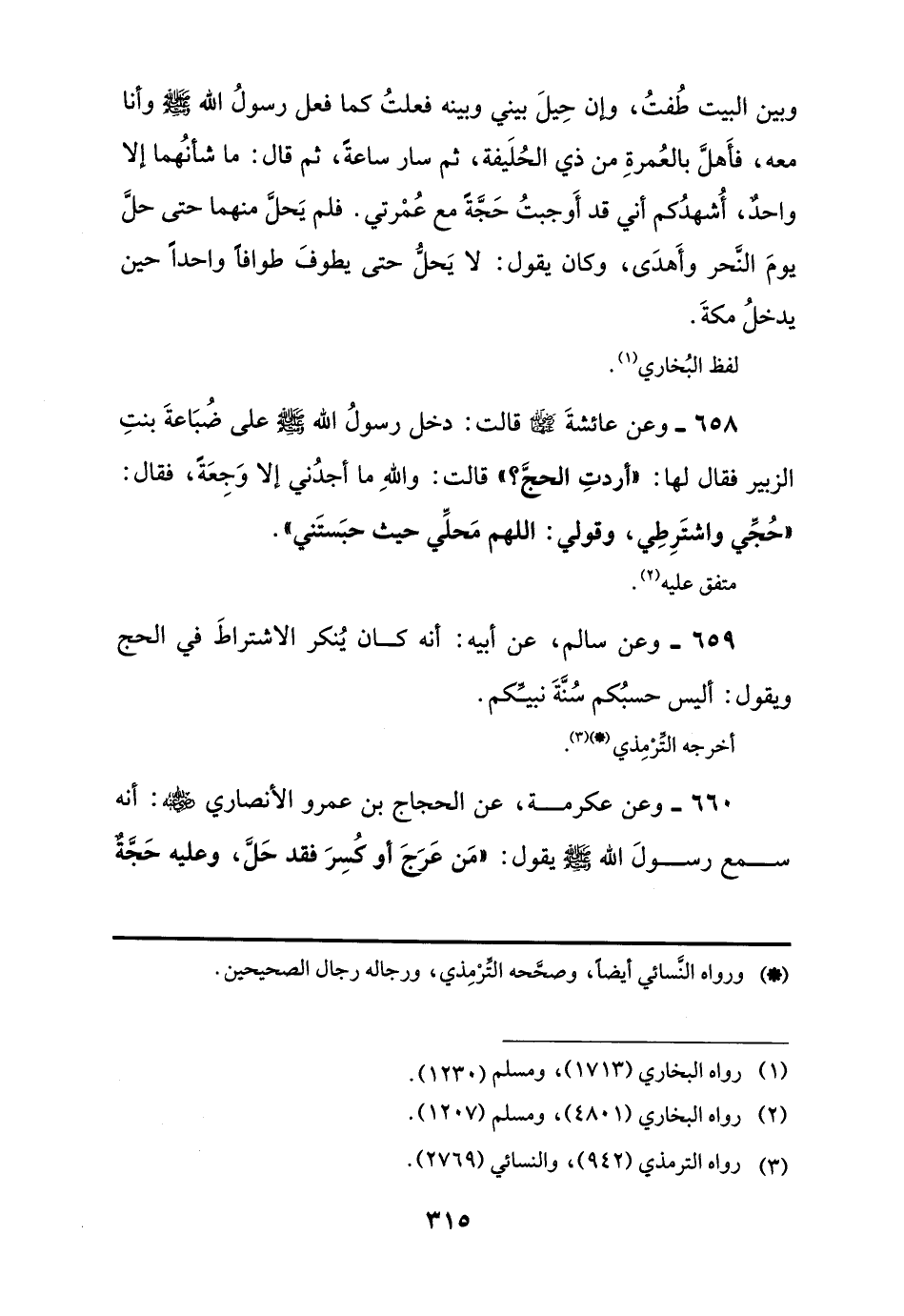 658 - وعن عائشةَ -رضي اللَّه عنها- قالت: دخل رسولُ اللَّه -صلى اللَّه عليه وسلم- على ضُبَاعةَ بنتِ الزبير فقال لها: "أردتِ الحجَّ؟ "، قالت: واللَّهِ ما أجدُني إلا وَجِعَةً، فقال: "حُجِّي واشتَرِطِي، وقولي: اللهم مَحلِّي حيث حبَستَني".