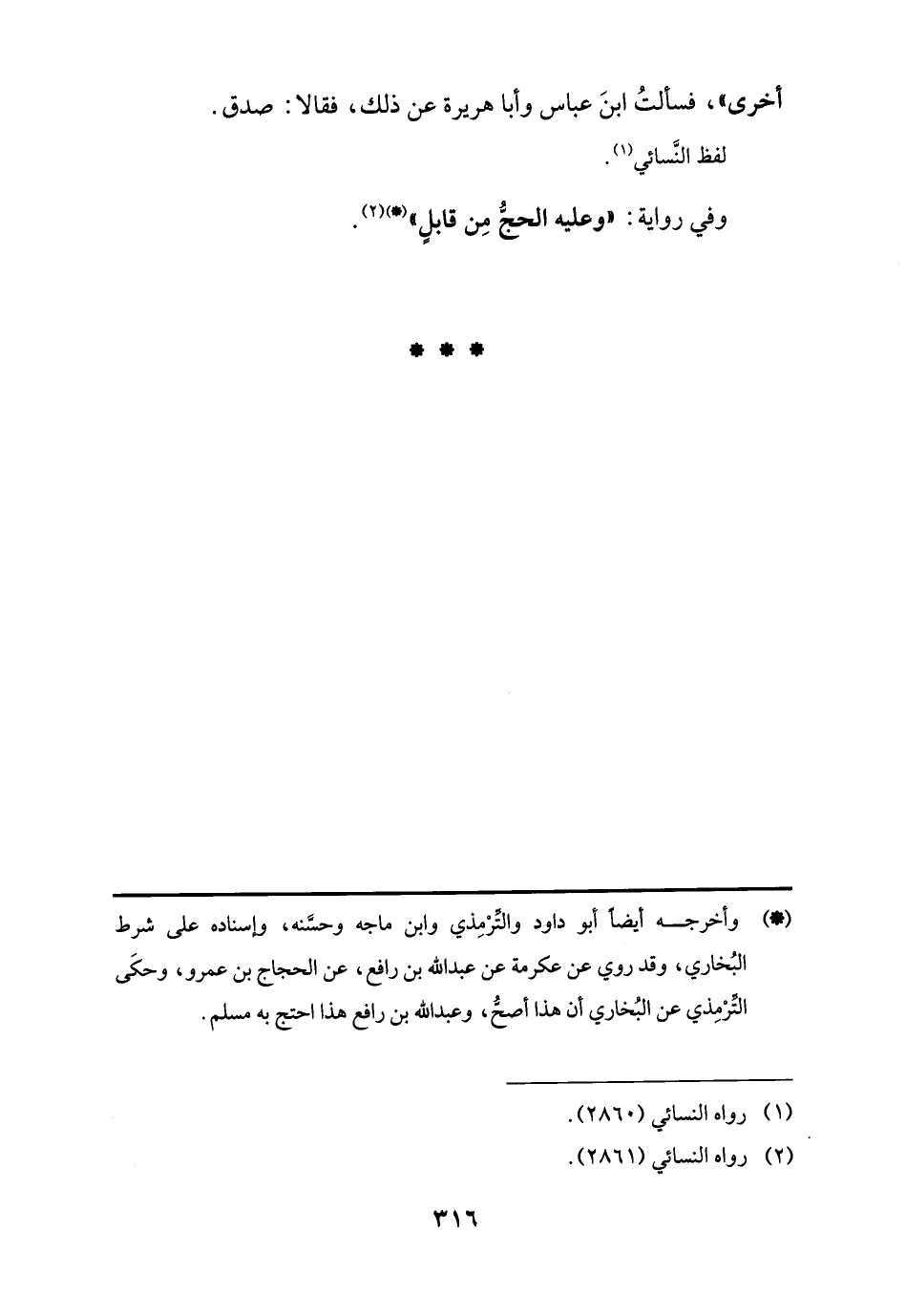 (*) وأخرجه أيضًا أبو داود والتِّرْمِذي وابن ماجه وحسَّنه، وإسناده على شرط البُخاري، وقد روي عن عكرمة عن عبد اللَّه بن رافع، عن الحجاج بن عمرو، وحكَى التِّرْمِذي عن البُخاري أن هذا أصحّ، وعبد اللَّه بن رافع هذا احتج به مسلم.