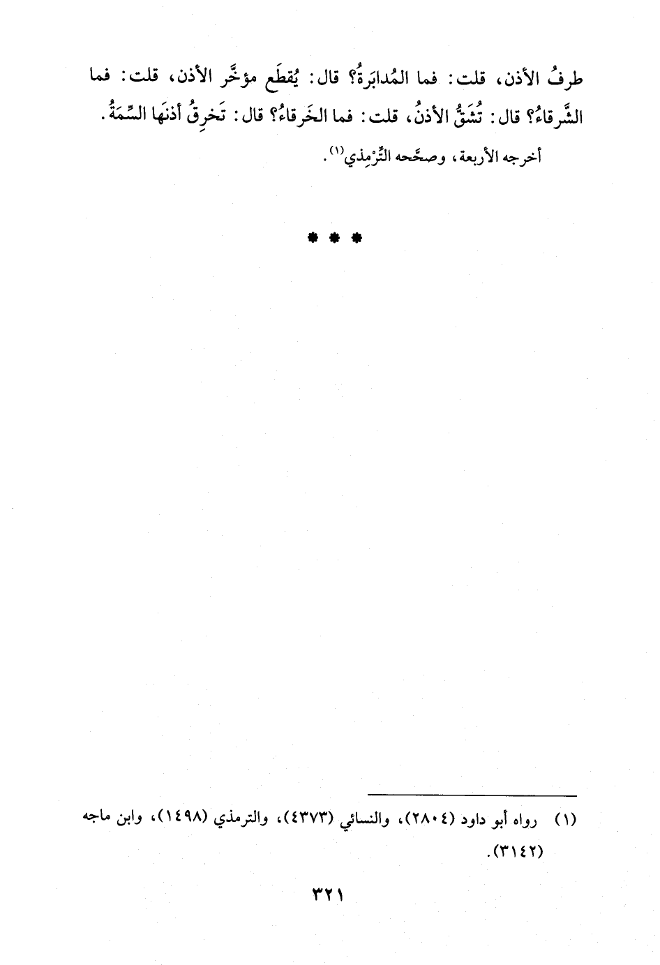 طرفُ الأذن، قلت: فما المُدابَرةُ؟ قال: يُقطَع مؤخَّر الأذن، قلت: فما الشَّرقاءُ؟ قال: تُشَقُّ الأذنُ، قلت: فما الخَرقاءُ؟ قال: تَخرِقُ أذنَها السِّمَةُ.