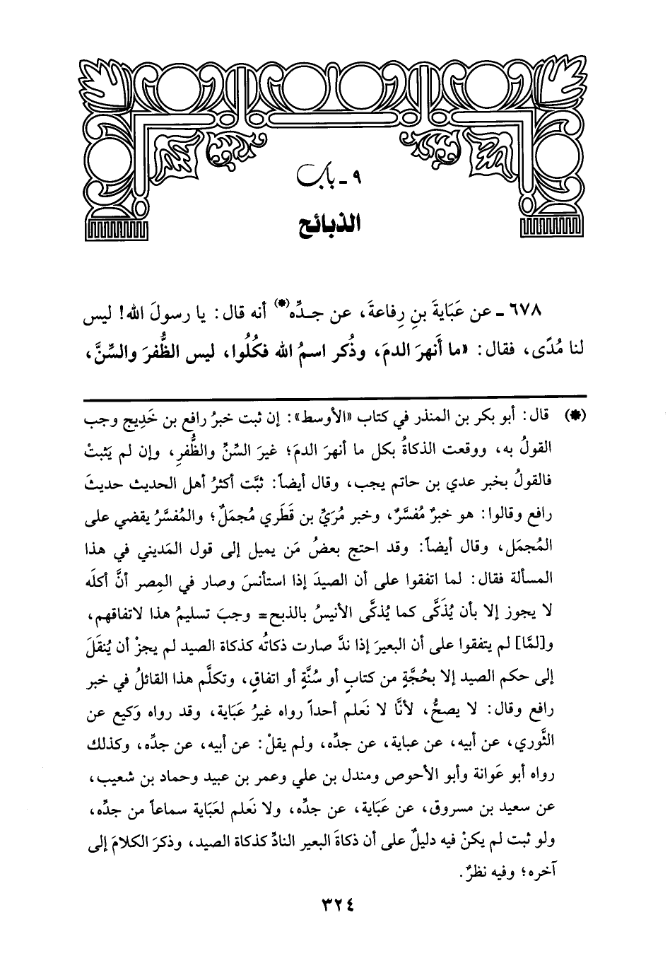 (*) قال: أبو بكر بن المنذر في كتاب "الأوسط": إن ثبت خبرُ رافع بن خَدِيج وجب القولُ به، ووقعت الذكاةُ بكل ما أنهرَ الدمَ؛ غيرَ السِّنِّ والظُّفرِ، وإن لم يَثبتْ فالقولُ بخبر عدي بن حاتم يجب، وقال أيضًا: ثبَّت أكثرُ أهل الحديث حديثَ رافع وقالوا: هو خبر مُفسر، وخبر مُرَيِّ بن قَطَري مُجمَلٌ؛ والمُفسَّرُ يقضي على المُجمَل، وقال أيضًا: وقد احتج بعضُ مَن يميل إلى قول المَديني في هذا المسألة فقال: لما اتفقوا على أن الصيدَ إذا استأنسَ وصار في المِصر أنَّ أكلَه لا يجوز إلا بأن يُذَكَّى كما يُذكَّى الأنيسُ بالذبح وجبَ تسليمُ هذا لاتفاقهم، و [لمَّا] لم يتفقوا على أن البعيرَ إذا ندَّ صارت ذكاتُه كذكاة الصيد لم يجزْ أن يُنقَلَ إلى حكم الصيد إلا بحُجَّةٍ من كتابٍ أو سُنَّةٍ أو اتفاقٍ، وتكلَّم هذا القائلُ في خبر رافع وقال: لا يصحُّ، لأنَّا لا نَعلم أحدًا رواه غيرُ عَبَاية، وقد رواه وَكيع عن الثَّوري، عن أبيه، عن عباية، عن جدِّه، ولم يقلْ: عن أبيه، عن جدِّه، وكذلك رواه أبو عَوانة وأبو الأحوص ومندل بن علي وعمر بن عبيد وحماد بن شعيب، عن سعيد بن مسروق، عن عَبَاية، عن جدِّه، ولا نَعلم لعَبَاية سماعًا من جدِّه، ولو ثبت لم يكنْ فيه دليلٌ على أن ذكاةَ البعير النادِّ كذكاة الصيد، وذكرَ الكلامَ إلى آخره؛ وفيه نظرٌ.