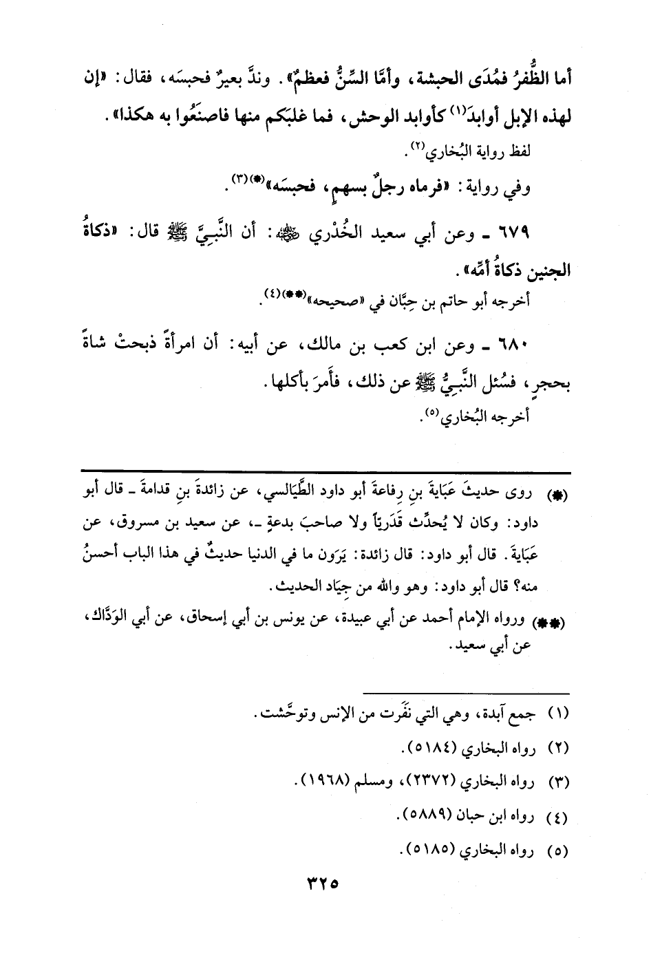 أما الظُّفرُ فمُدَى الحبشة، وأمَّا السِّنُّ فعظمٌ". وندَّ بعيرٌ فحبسَه، فقال: "إن لهذه الإبل أوابدَ (¬1) كأوابد الوحش، فما غلبَكم منها فاصنَعُوا به هكذا".