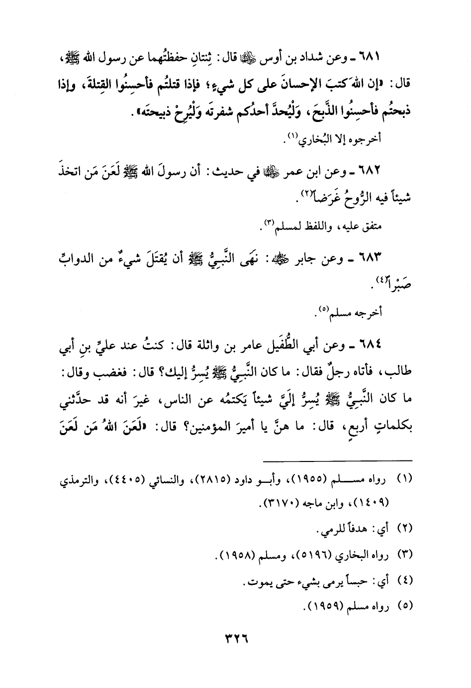681 - وعن شداد بن أوس -رضي اللَّه عنهما- قال: ثِنتانِ حفظتُهما عن رسول اللَّه -صلى اللَّه عليه وسلم-، قال: "إن اللَّهَ كتبَ الإحسانَ على كل شيءٍ؛ فإذا قتلتُم فأحسِنُوا القِتلةَ، وإذا ذبحتُم فاحسِنُوا الذَّبحَ، وَلْيُحدَّ أحدُكم شفرتَه وَلْيُرِحْ ذبيحتَه".