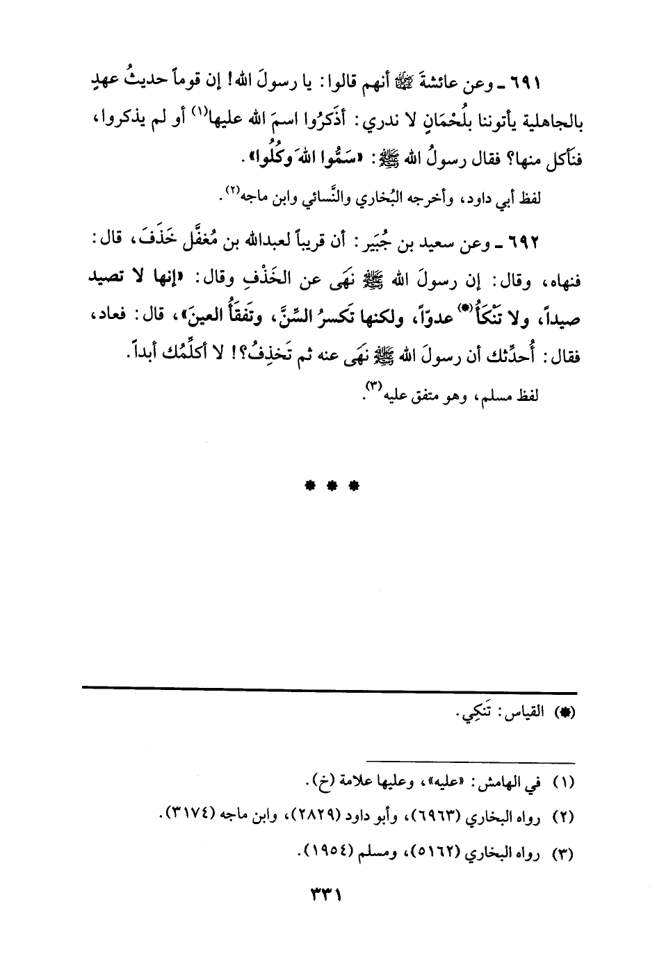 692 - وعن سعيد بن جُبَير: أن قريبًا لعبد الله بن مُغفل خَذَفَ، قال: فنهاه، وقال: إن رسولَ اللَّه -صلى اللَّه عليه وسلم- نَهَى عن الخَذْفِ وقال: "إنها لا تصيد صيدًا، ولا تَنْكَأُ (*) عدوًّا، ولكنها تَكسرُ السِّنَّ، وتَفقَأُ العينَ"، قال: فعاد، فقال: أُحدِّثك أن رسولَ اللَّه -صلى اللَّه عليه وسلم- نَهَى عنه ثم تَخذِفُ؟! لا أكلِّمُك أبدًا.