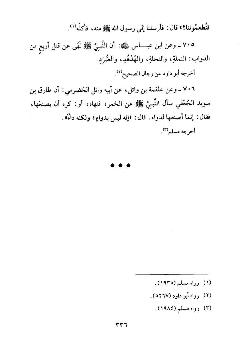 706 - وعن علقمة بن وائل، عن أبيه وائل الحَضرمي: أن طارق بن سويد الجُعْفي سأل النَّبِيَّ -صلى اللَّه عليه وسلم- عن الخمر، فنهاه، أو: كره أن يصنعَها، فقال: إنما أصنعها لدواء. قال: "إنه ليس بدواءٍ؛ ولكنه داءٌ".