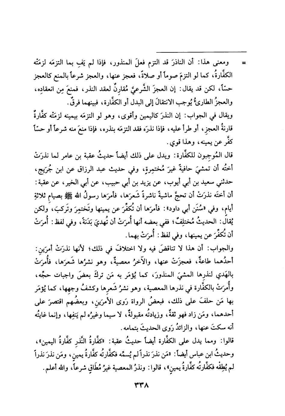قالوا: ومما يدل على الكفَّارة أيضًا حديثُ عقبة: "كفَّارةُ النَّذرِ كفَّارةُ اليمين"، وحديثُ ابن عباس أيضًا: "مَن نذرَ نذرًا لم يُسمِّه فكفَّارتُه كفَّارةُ يمينٍ، ومَن نذرَ نذرًا لم يُطِقْه فكفَّارتُه كفَّارةُ يمينٍ"، قالوا: ونذرُ المعصية غيرُ مُطَاقٍ شرعًا، واللَّه أعلم.
