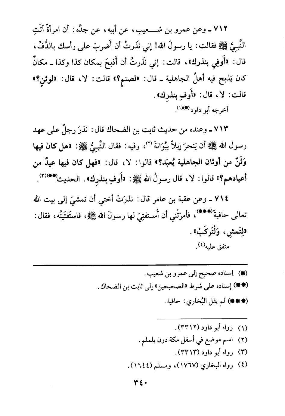 712 - وعن عمرو بن شعيب، عن أبيه، عن جدِّه: أن امرأةً أتَتِ النَّبِيَّ -صلى اللَّه عليه وسلم- فقالت: يا رسولَ اللَّه! إني نَذرتُ أن أَضربَ على رأسك بالدُّفِّ، قال: "أَوفِي بنذرك"، قالت: إني نَذرتُ أن أَذبحَ بمكان كذا وكذا -مكانٌ كان يَذبح فيه أهلُ الجاهلية- قال: "لصنمٍ؟ "، قالت: لا، قال: "لوثنٍ؟ "، قالت: لا، قال: "أَوفِ بنذرِك".