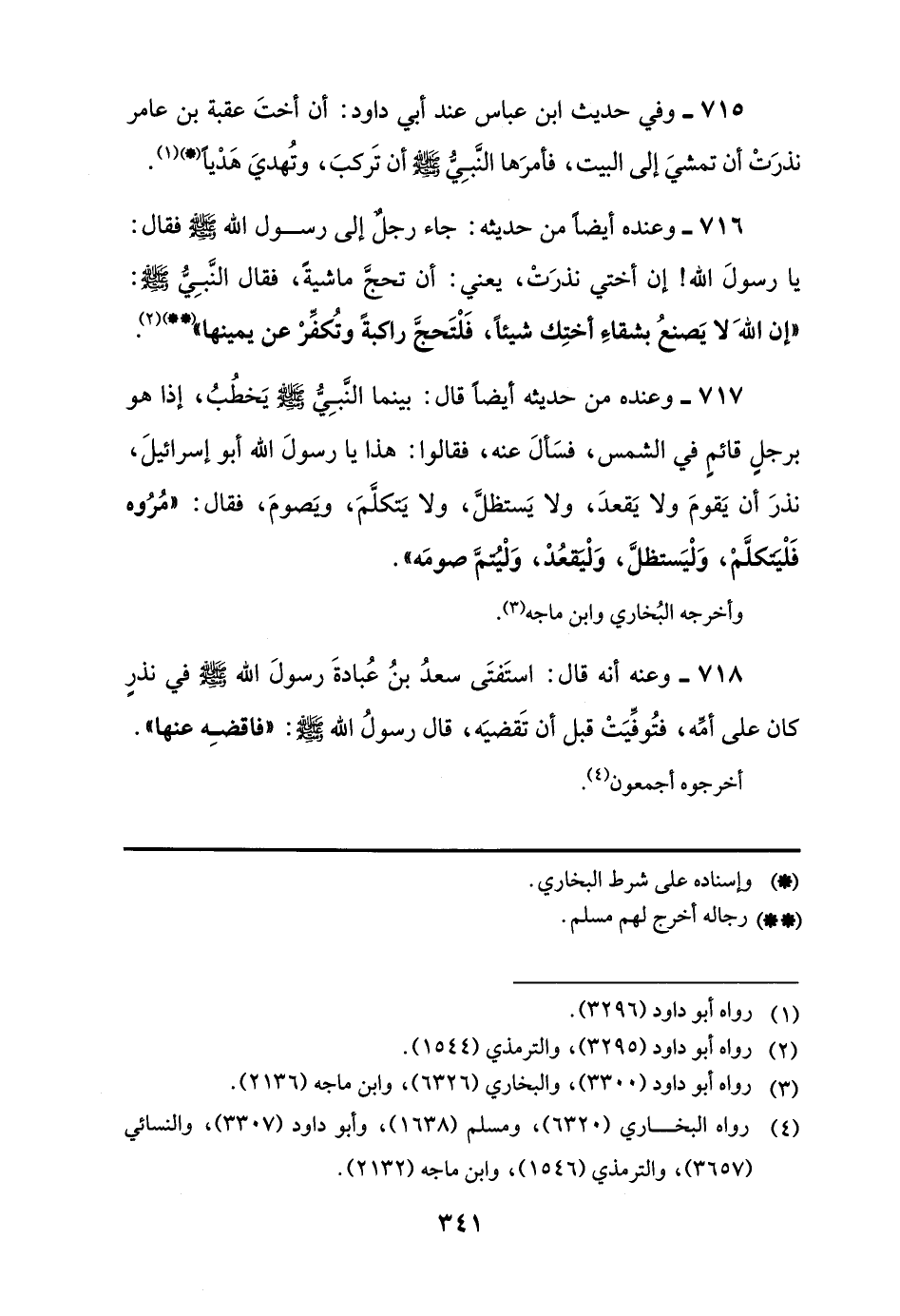 717 - وعنده من حديثه أيضًا قال: بينما النَّبِيُّ -صلى اللَّه عليه وسلم- يَخطُبُ، إذا هو برجلٍ قائمٍ في الشمس، فسَألَ عنه، فقالوا: هذا يا رسولَ اللَّه أبو إسرائيلَ، نذرَ أن يَقومَ ولا يَقعدَ، ولا يَستظلَّ، ولا يَتكلَّمَ، ويَصومَ، فقال: "مُرُوه فَلْيتكلَّمْ، وَلْيَستظلَّ، وَلْيقعُد، وَلْيُتمَّ صومَه".
